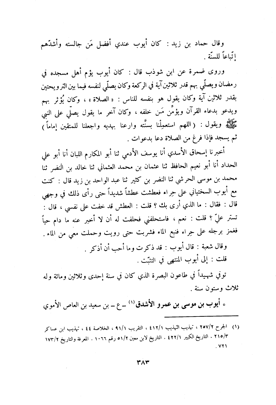 وَرَوَى ضَمْرَةُ عَنِ ابْنِ شَوْذَبٍ قَالَ: كَانَ أَيّوُب يَؤُمُّ أَهْلَ مَسْجِدِهِ فِي رَمَضَانَ وَيُصَلِّي بِهِمْ قَدْرَ ثَلاثِينَ آيَةٍ فِي الركعة وكان يصلي لنفسه فيما بين الترويحتين بقدر ثلاثين آية وَكَانَ يَقُولُ هُوَ بِنَفْسِهِ لِلنَّاسِ: «الصَّلاةَ» ، وَكَانَ يُؤْثِرُ بِهِمْ وَيَدْعُو بِدُعَاءِ الْقُرْآنِ وَيُؤَمِّنُ مَنْ خَلْفَهُ، وَكَانَ آخِرُ مَا يَقُولُ يُصَلِّي عَلَى النَّبِيِّ صَلَّى اللَّهُ عَلَيْهِ وَسَلَّمَ وَيَقُولُ: (اللَّهمّ استعملنا بسنّته وارعنا بهداه وَاجْعَلْنا لِلْمُتَّقِينَ إِماماً) 25: 74 ثُمَّ يَسْجُدُ فَإِذَا فَرَغَ مِنَ الصَّلاةِ دَعَا بِدَعَوَاتٍ.