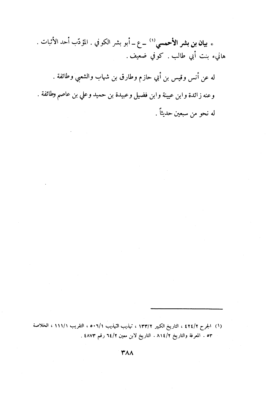 بيان بن بشر الأحمسي [1]- ع- أبو بشر الكوفي. المؤدّب أَحَدُ الأَثْبَاتِ.