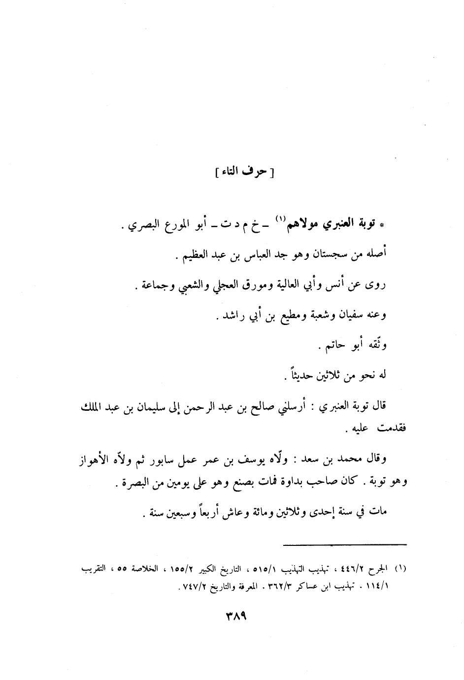 [1] الجرح 2/ 446، تهذيب التهذيب 1/ 515، التاريخ الكبير 2/ 155، الخلاصة 55، التقريب 1/ 114، تهذيب ابن عساكر 3/ 362، المعرفة والتاريخ 2/ 747.