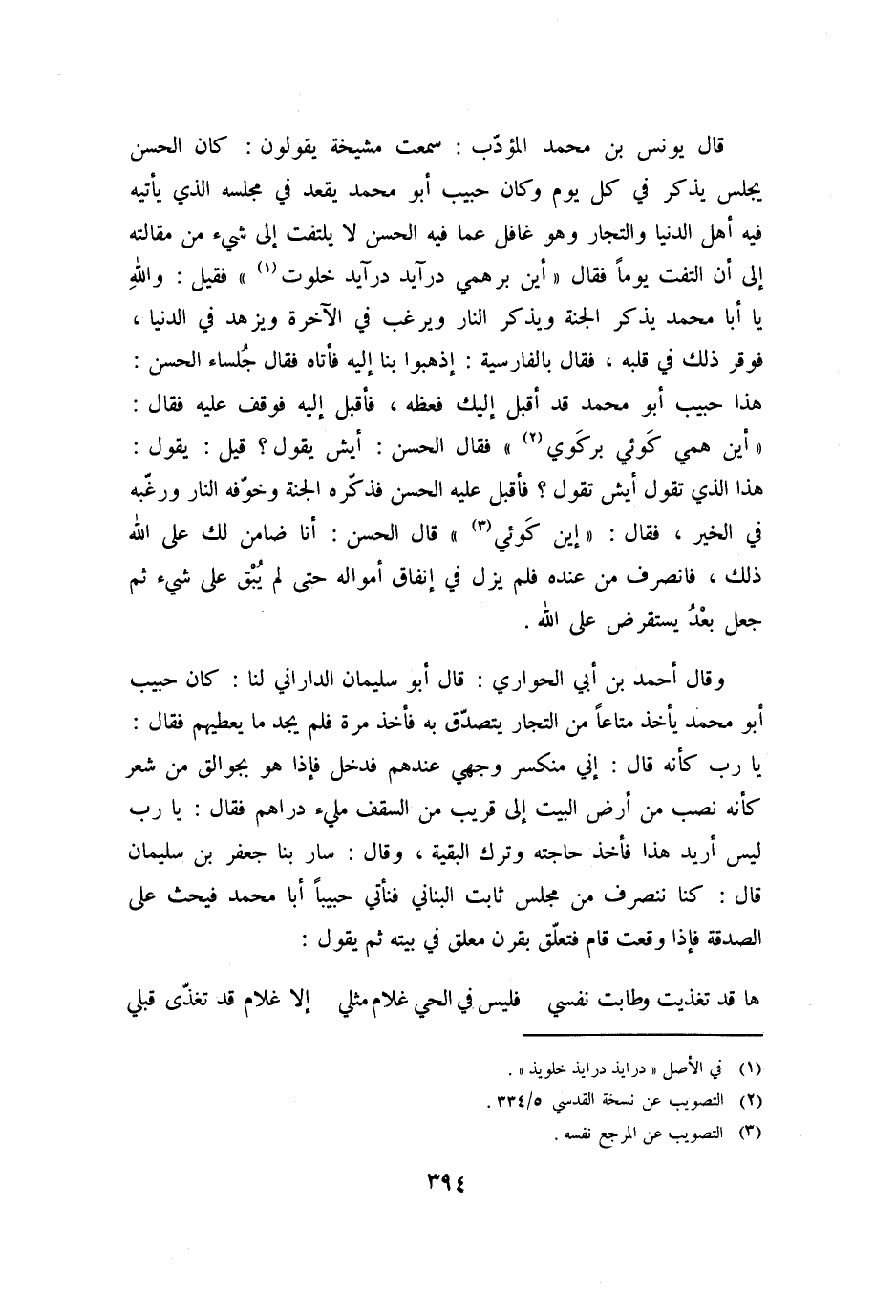 قَالَ يُونُسُ بْنُ مُحَمَّدٍ الْمُؤَدِّبُ: سَمِعْتُ مَشْيَخَةً يَقُولُونَ: كَانَ الْحَسَنُ يَجْلِسُ يَذْكُرُ فِي كُلِّ يَوْمٍ وَكَانَ حَبِيبٌ أَبُو مُحَمَّدٍ يَقْعُدُ فِي مَجْلِسِهِ الَّذِي يَأْتِيهِ فِيهِ أَهْلُ الدُّنْيَا وَالتُّجَّارُ وَهُوَ غَافِلٌ عَمَّا فِيهِ الْحَسَنُ لا يَلْتَفِتُ إِلَى شَيْءٍ مِنْ مَقَالَتِهِ إِلَى أَنِ الْتَفَتَ يوما فقال «أين برهمي درآيد درآيد خلوت [1] » فَقِيلَ: وَاللَّهِ يَا أَبَا مُحَمَّدٍ يَذْكُرُ الْجَنَّةَ وَيَذْكُرُ النَّارَ وَيُرَغِّبُ فِي الآخِرَةِ وَيُزَهِّدُ فِي الدُّنْيَا، فَوَقَرَ ذَلِكَ فِي قَلْبِهِ، فَقَالَ بِالْفَارِسِيَّةِ: اذْهَبُوا بِنَا إِلَيْهِ فَأَتَاهُ فَقَالَ جُلَسَاءُ الْحَسَنِ: