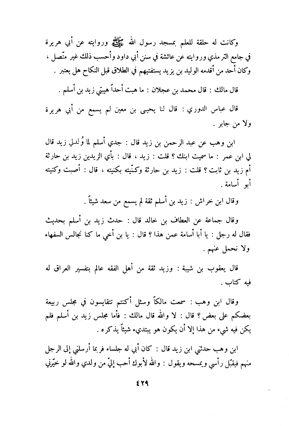 وَقَالَ ابْنُ وَهْبٍ: سَمِعْتُ مَالِكًا وَسُئِلَ أَكُنْتُمْ تَتَقَايَسُونُ فِي مَجْلِسِ رَبِيعَةَ بَعْضُكُمْ عَلَى بَعْضٍ؟ قَالَ: لا وَاللَّهِ قَالَ مَالِكٌ: فَأَمَّا مَجْلِسُ زَيْدِ بْنِ أَسْلَمَ فَلَمْ يَكُنْ فِيهِ شَيْءٌ مِنْ هَذَا إِلا أَنْ يَكُونَ هُوَ يَبْتَدِئُ شَيْئًا يَذْكُرُهُ.