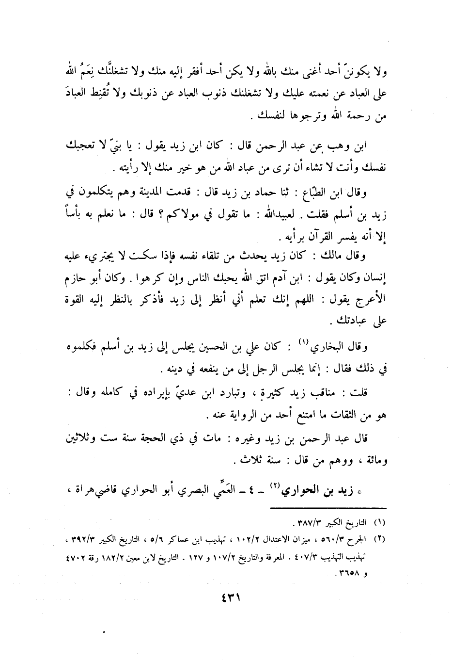 ابْنَ وَهْبٍ عَنْ عَبْدِ الرَّحْمَنِ قَالَ: كَانَ ابْنُ زَيْدٍ يَقوُل: يَا بُنَيَّ لا تُعْجِبْكَ نَفْسَكَ وأنت لا تَشَاءُ أَنْ تَرَى مِنْ عِبَادِ اللَّهِ مِنْ هُوَ خَيْرٌ مِنْكَ إِلا رَأَيْتَهُ.