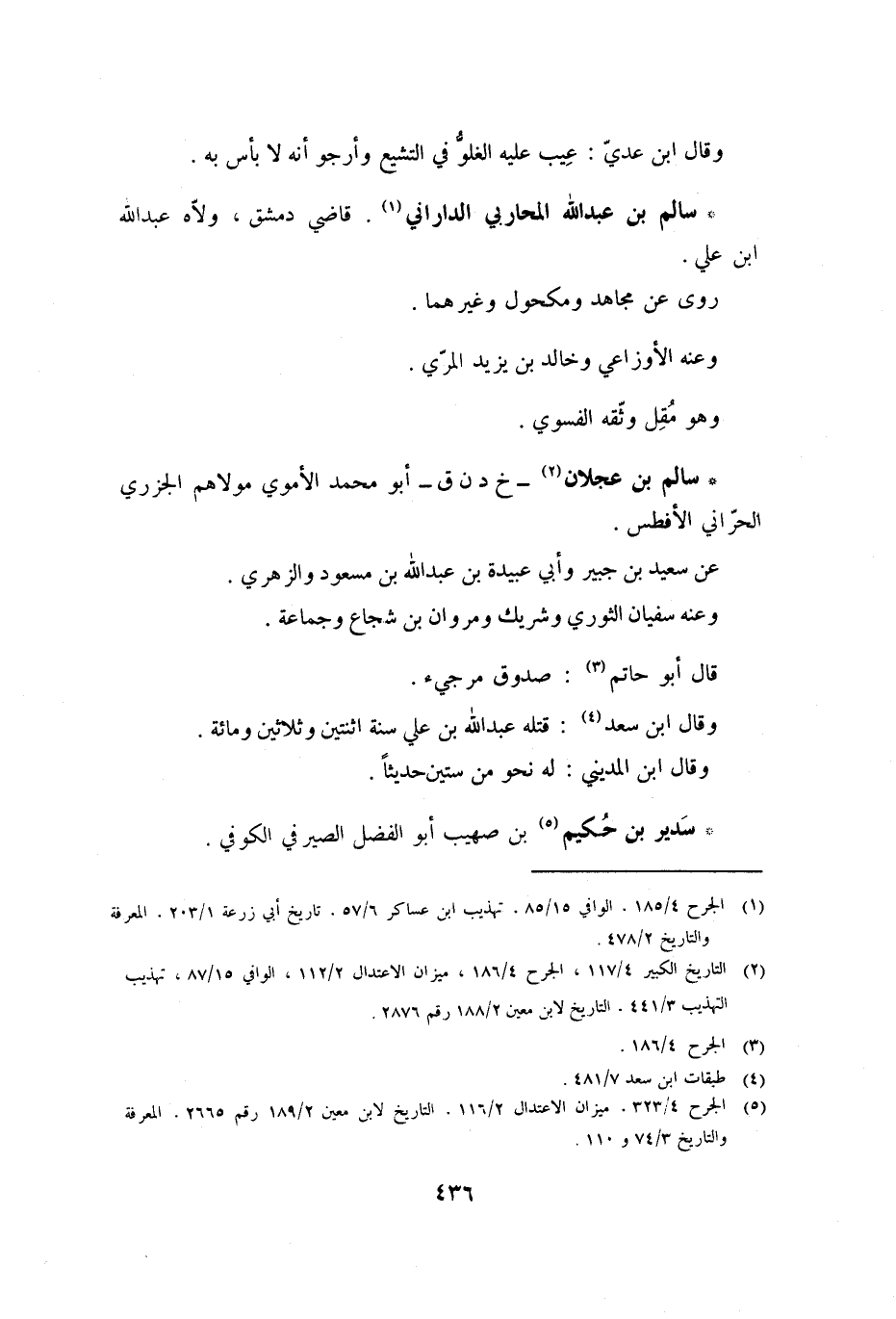 [1] الجرح 4/ 185. الوافي 15/ 85. تهذيب ابن عساكر 6/ 57. تاريخ أبي زرعة 1/ 203. المعرفة والتاريخ 2/ 478.