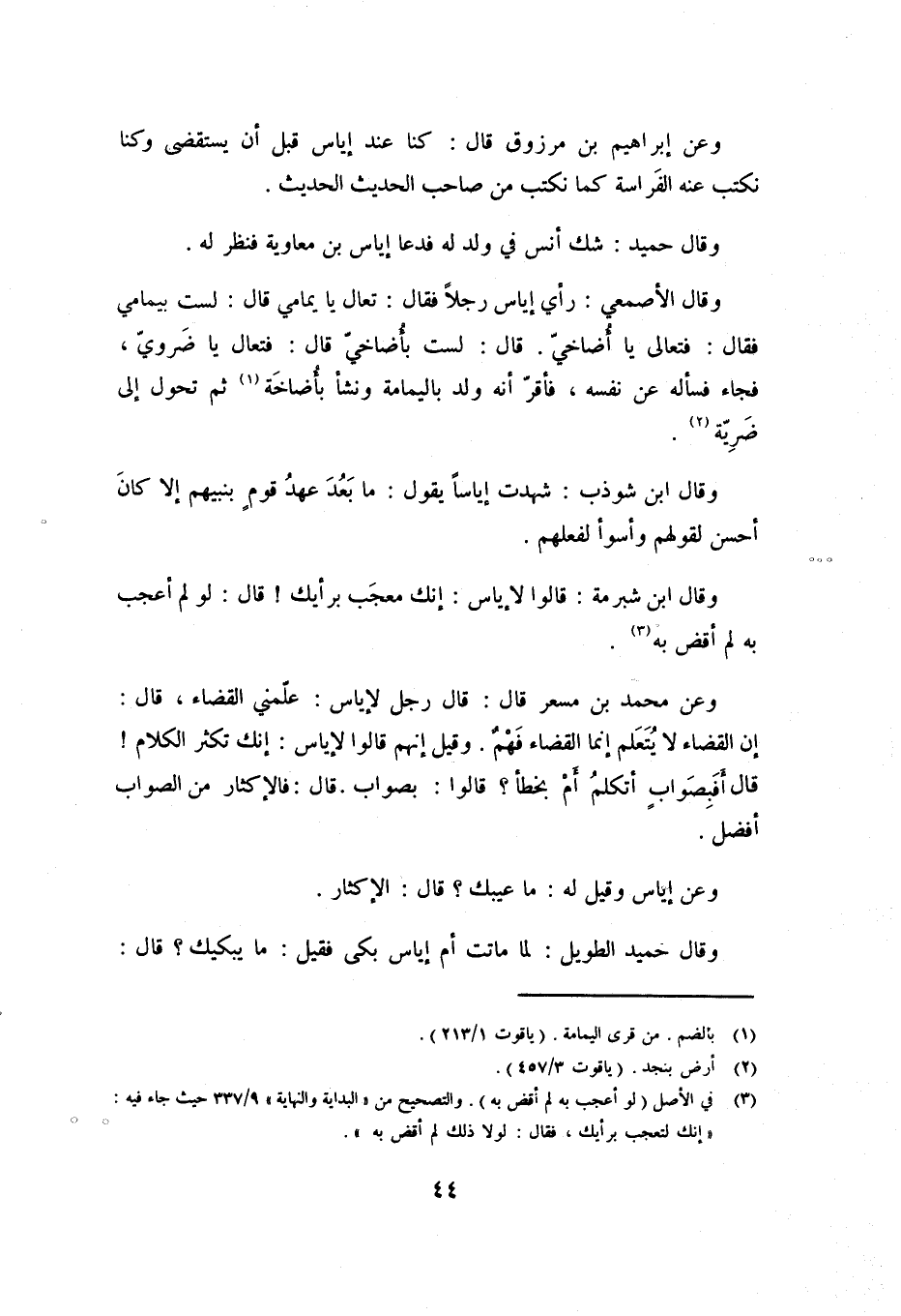 إِنَّ الْقَضَاءَ لا يُتَعَلَّمُ إِنَّمَا الْقَضَاءُ فَهْمٌ. وَقِيلَ إِنَّهُمْ قَالُوا لِإِيَاسٍ: إِنَّكَ تُكْثِرُ الْكَلامَ! قَالَ أَفَبِصَوابٍ أَتَكَلَّمُ أَمْ بِخَطَأٍ؟ قَالُوا: بصواب. قَالَ: فَالإِكْثَارُ مِنَ الصَّوَابِ أَفْضَلُ.