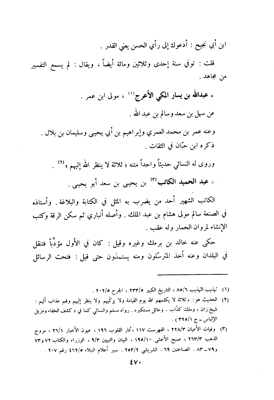 وَرَوَى لَهُ النَّسَائِيُّ حَدِيثًا وَاحِدًا مَتْنُهُ «ثَلاثَةٌ لا يَنْظُرُ اللَّهُ إِلَيْهِمْ» [2] . عَبْدُ الْحَمِيدِ الْكَاتِبُ [3] بْنُ يَحْيَى بْنِ سَعْدٍ أَبُو يَحْيَى.