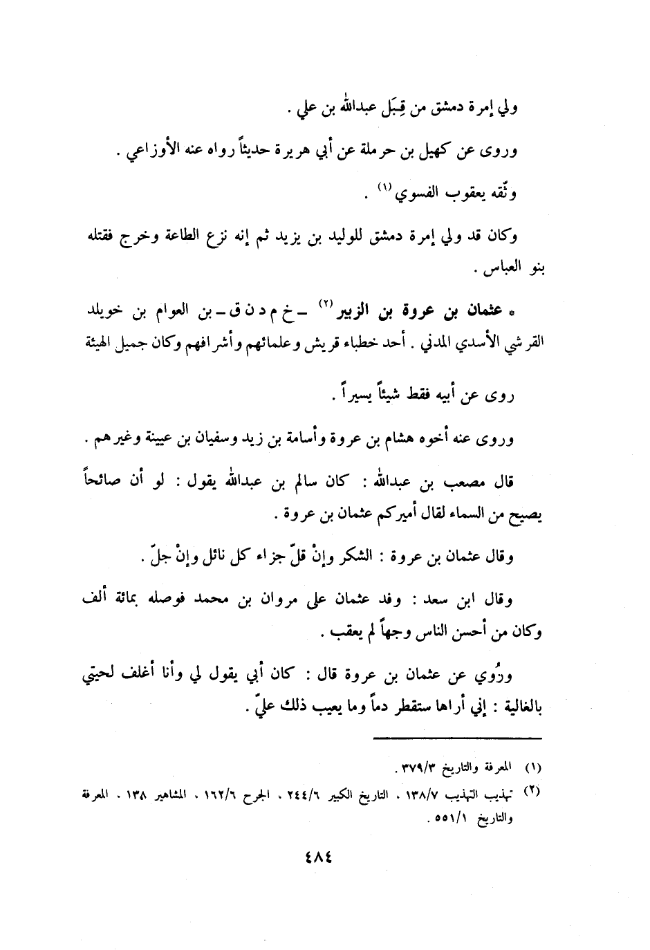 عُثْمَانُ بْنُ عروة بن الزبير [2]- خ م د ن ق- بْنِ الْعَوَّامِ بْنِ خُوَيْلِدٍ الْقُرَشِيُّ الأَسَدِيُّ الْمَدَنِيُّ. أَحَدُ خُطَبَاءِ قُرَيْشٍ وَعُلَمَائِهِمْ وَأَشْرَافِهِمْ وَكَانَ جَمِيلَ الْهَيْئَةِ رَوَى عَنْ أَبِيهِ فَقَطْ شَيْئًا يَسِيرًا.