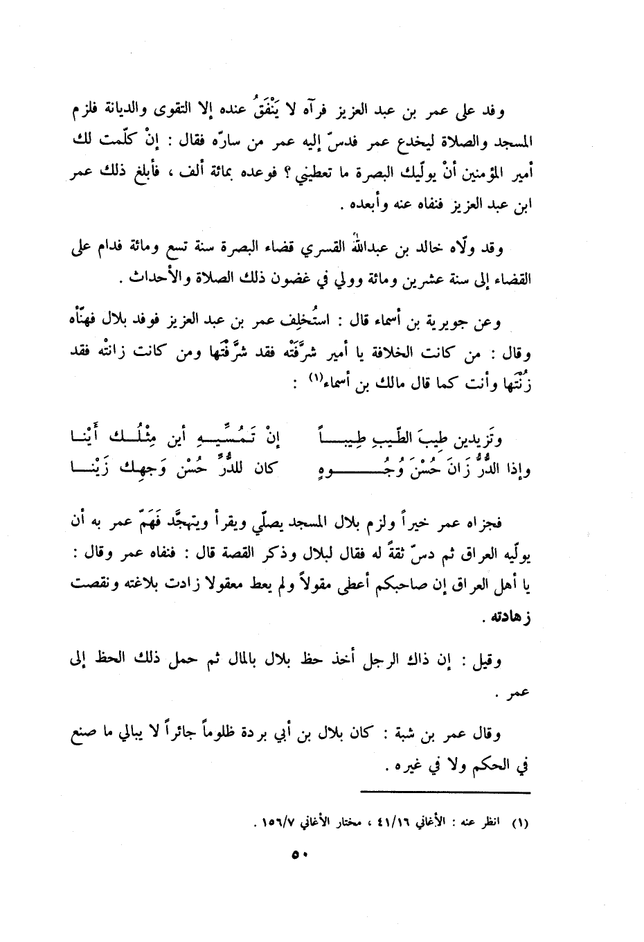 فَجَزَاهُ عُمَرُ خَيْرًا وَلَزِمَ بِلالُ الْمَسْجِدَ يُصَلِّي وَيَقْرَأُ وَيَتَهَجَّدُ فَهَمَّ عُمَرُ بِهِ أَنْ يُوَلِّيَهُ الْعِرَاقَ ثُمَّ دَسَّ ثِقَةً لَهُ فَقَالَ لِبِلالٍ وَذَكَرَ الْقِصَّةَ قَالَ: فَنَفَاهُ عُمَرُ وَقَالَ: