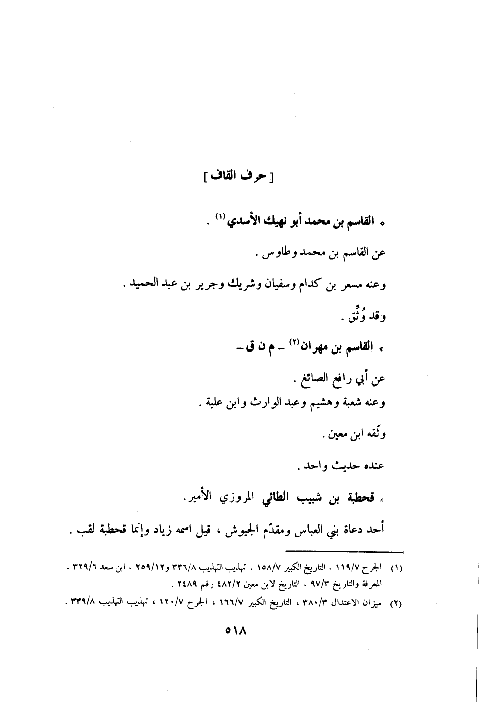 [1] الجرح 7/ 119. التاريخ الكبير 7/ 158. تهذيب التهذيب 8/ 336 و 12/ 259. ابن سعد 6/ 329.