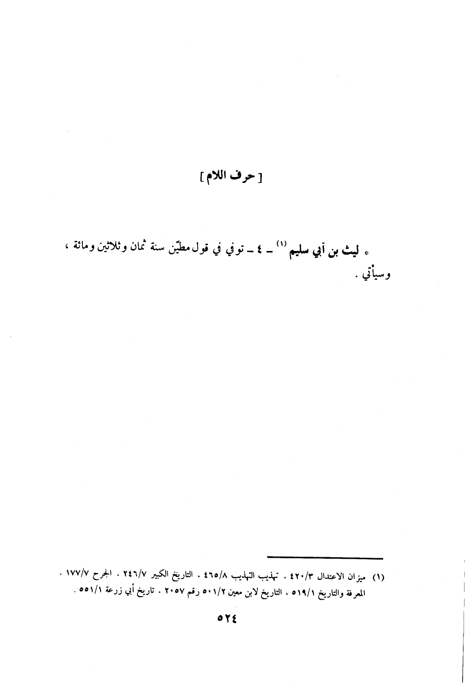 لَيْثُ بْنُ أَبِي سُلَيْمٍ [1]- 4- تُوُفِّيَ فِي قَوْلِ مُطَيَّنٍ سَنَةَ ثَمَانٍ وَثَلاثِينَ وَمِائَةٍ، وسيأتي.