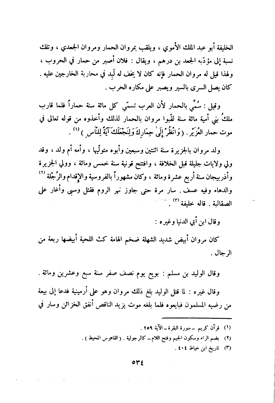 وَقِيلَ: سُمِّيَ بِالْحِمَارِ لِأَنَّ الْعَرَبَ تُسَمِّي كُلَّ مِائَةِ سَنَةٍ حِمَارًا فَلَمَّا قَارَبَ مُلْكُ بَنِي أُمَيَّةَ مِائَةَ سَنَةٍ لَقَّبُوا مَرْوَانَ بِالْحِمَارِ لِذَلِكَ وَأَخَذُوهُ مِنْ قَوْلِهِ تَعَالَى فِي مَوْتِ حِمَارِ الْعُزَيْرِ. (وَانْظُرْ إِلى حِمارِكَ وَلِنَجْعَلَكَ آيَةً لِلنَّاسِ) 2: 259 [1] .