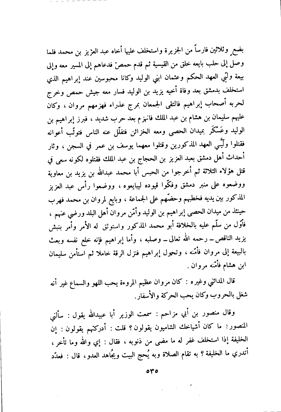 بِضْعٍ وَثَلاثِينَ فَارِسًا مِنَ الْجَزِيرَةِ وَاسْتَخْلَفَ عَلَيْهَا أَخَاهُ عَبْدَ الْعَزِيزِ بْنَ مُحَمَّدٍ فَلَمَّا وَصَلَ إِلَى حَلَبَ بَايَعَهُ خَلْقٌ مِنَ الْقَيْسِيَّةِ ثُمَّ قَدِمَ حِمْصَ فَدَعَاهُمْ إِلَى الْمَسِيرِ مَعَهُ وَإِلَى بَيْعَةِ وَلِيَّيِ الْعَهْدِ الْحَكَمِ وَعُثْمَانَ ابْنَيِ الْوَلِيدِ وَكَانَا مَحْبُوسَيْنِ عِنْدَ إِبْرَاهِيمَ الَّذِي اسْتُخْلِفَ بِدِمَشْقَ بَعْدَ وَفَاةِ أَخِيهِ يَزِيدَ بْنِ الْوَلِيدِ فَسَارَ مَعَهُ جَيْشُ حِمْصَ وَخَرَجَ لِحَرْبِهِ أَصْحَابُ إِبْرَاهِيمَ فَالْتَقَى الْجَمْعَانِ بِمَرْجِ عَذْرَاءَ فَهَزَمَهُمْ مَرْوَانُ، وَكَانَ عَلَيْهِمْ سُلَيْمَانُ بْنُ هِشَامِ بْنِ عَبْدِ الْمَلِكِ فَانْهَزَمَ بَعْدَ حَرْبٍ شَدِيدٍ، فَبَرَزَ إِبْرَاهِيمُ بْنُ الْوَلِيدِ وَعَسْكَرَ بِمَيْدَانِ الْحَصَى وَمَعَهُ الْخَزَائِنُ فَتَفَلَّلَ عَنْهُ النَّاسُ فَتَوَثَّبَ أَعْوَانَهُ فَقَتَلُوا وَلِيَّيِ الْعَهْدِ الْمَذْكُورَيْنِ وَقَتَلُوا مَعَهُمَا يُوسُفَ بْنَ عُمَرَ فِي السِّجْنِ، وَثَارَ أَحْدَاثِ أَهْلِ دِمَشْقَ بِعَبْدِ الْعَزِيزِ بْنِ الْحَجَّاجِ بْنِ عَبْدِ الْمَلِكِ فَقَتَلُوهُ لِكَوْنِهِ سَعَى فِي قَتْلِ هَؤُلاءِ الثَّلاثَةِ ثُمَّ أَخْرَجُوا مِنَ الْحَبْسِ أَبَا مُحَمَّدٍ عَبْدَ اللَّهِ بْنَ يَزِيدَ بْنِ مُعَاوِيَةَ وَوَضَعُوهُ عَلَى مِنْبَرِ دِمَشْقَ وَفَكُّوا قُيُودَهُ لِيُبَايِعُوهُ، وَوَضَعُوا رَأْسَ عَبْدِ الْعَزِيزِ الْمَذْكُورِ بَيْنَ يَدَيْهِ فَخَطَبَهُمْ وَحَضَّهُمْ عَلَى الْجَمَاعَةِ، وَبَايَعَ لِمَرْوَانَ بْنِ مُحَمَّدٍ فَهَرَبَ حِينَئِذٍ مِنْ مَيْدَانِ الْحَصَى إِبْرَاهِيمُ بْنُ الْوَلِيدِ وَأَمَّنَ مَرْوَانُ أَهْلَ الْبَلَدِ وَرَضِيَ عَنْهُمْ، فَأَوَّلُ مَنْ سَلَّمَ عَلَيْهِ بِالْخِلافَةِ أَبُو مُحَمَّدٍ الْمَذْكُورُ وَاسْتَوْثَقَ لَهُ الأَمْرُ وَأَمَرَ بِنَبْشِ يَزِيدَ النَّاقِصِ- رَحِمَهُ اللَّهُ تَعَالَى- وَصَلَبَهُ، وَأَمَّا إِبْرَاهِيمُ فَإِنَّهُ خَلَعَ نَفْسَهُ وَبَعَثَ بِالْبَيْعَةِ إِلَى مَرْوَانَ فَأَمَّنَهُ، وَتَحَوَّلَ إِبْرَاهِيمُ فنزل الرقة خاملا ثم استأمن سليمان ابن هِشَامٍ فَأَمَّنَهُ مَرْوَانُ.