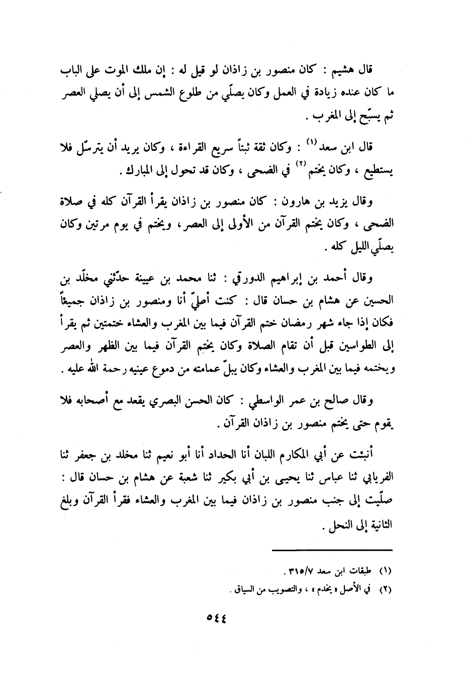 وقال يزيد بن هارون: كان منصور بن زاذان يقرأ القرآن كله فِي صلاة الضحي، وكان يختم القرآن من الأولى إلى العصر، ويختم فِي يوم مرتين وكان يصلي الليل كله.