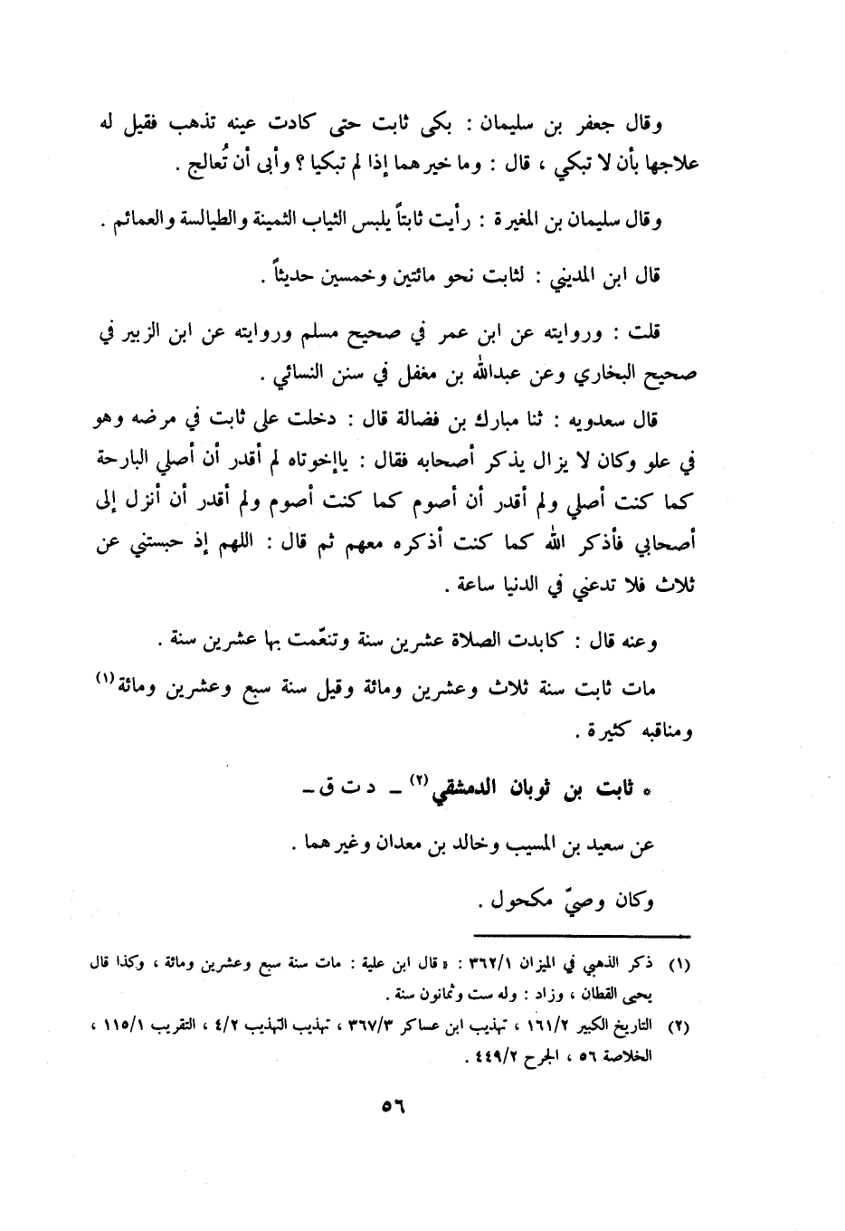 وَقَالَ جَعْفَرُ بْنُ سُلَيْمَانُ: بَكَى ثَابِتٌ حَتَّى كَادَتْ عَيْنُهُ تَذْهَبُ فَقِيلَ لَهُ عِلاجَهَا بِأَنْ لا تبكي، قال: وما خير هما إِذَا لَمْ تَبْكِيَا؟ وَأَبَى أَنْ تُعَالَجَ.