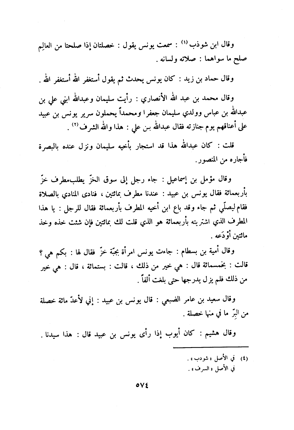 وقال مُحَمَّد بن عَبْد الله الأَنْصَارِيّ: رَأَيْت سُلَيْمَان وعبد الله ابني علي بن عَبْد الله بن عَبَّاس وولدي سُلَيْمَان جعفرا ومحمدًا يحملون سرير يونس بن عُبَيْد على أعناقهم يوم جنازته فقال عَبْد الله بن علي: هذا والله الشرف [2] .