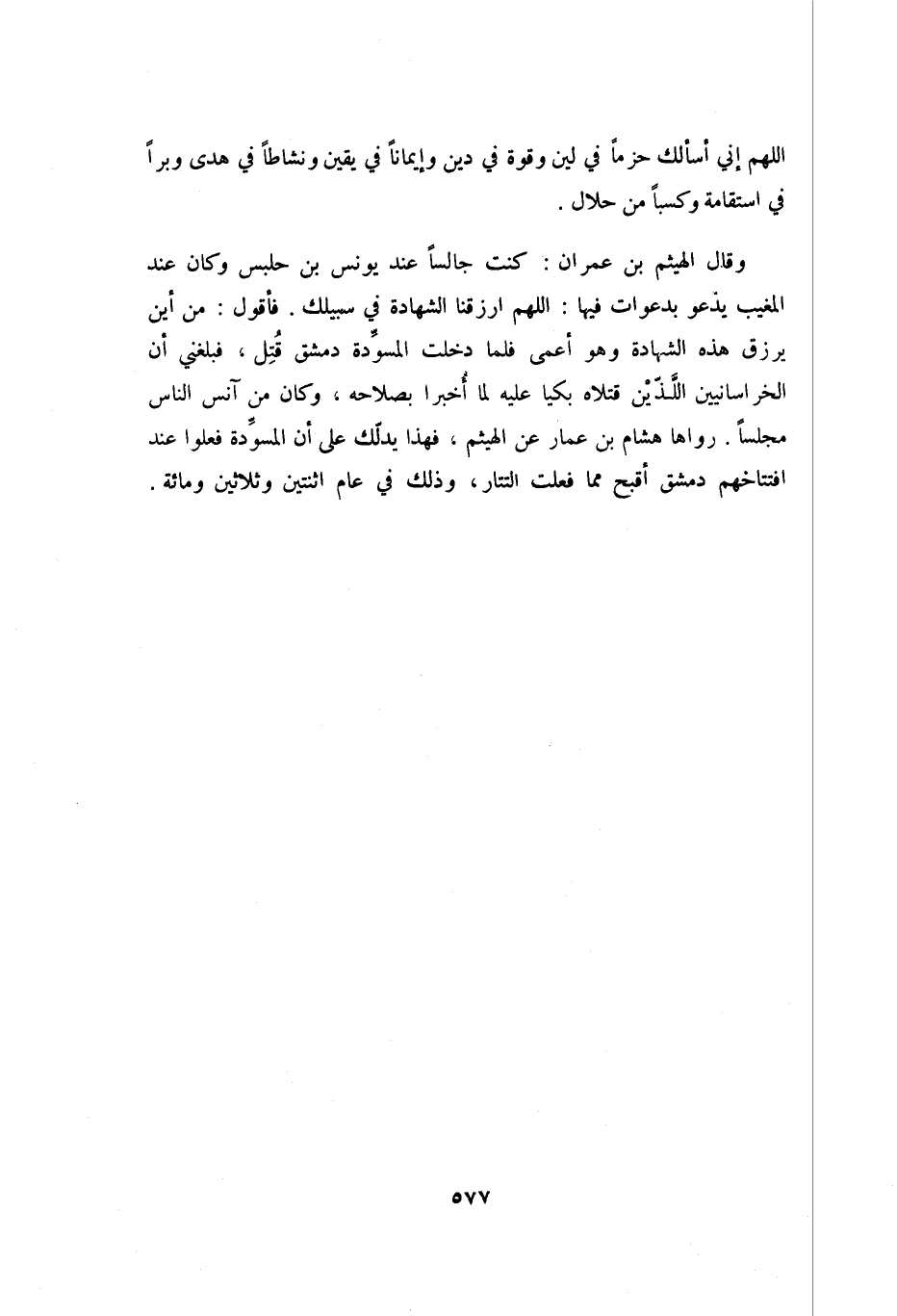 وقال الهيثم بن عمران: كنت جالسًا عند يونس بن حلبس وكان عند المغيب يدعو بدعوات فيها: اللَّهمّ ارزقنا الشهادة فِي سبيلك. فأقول: من أَيْنَ يرزق هذه الشهادة وهو أعمى فلما دخلت المسودة دمشق قُتِل، فبلغني أن الخراسانيين اللَّذيْن قتلاه بكيا عليه لما أخبرا بصلاحه، وكان من آنس الناس مجلسًا. رواها هشام بن عمار عن الهيثم، فهذا يدلّك على أن المسوّدة فعلوا عند افتتاخهم دمشق أقبح مما فعلت التتار، وذلك فِي عام اثنتين وثلاثين ومائة.