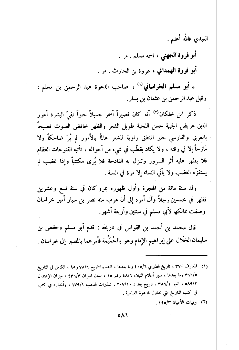 [1] المعارف 370، تاريخ الطبري 6/ 405 وما بعدها، البدء والتاريخ 6/ 78 و 95، الكامل في التاريخ 5/ 366 وما بعدها، سير أعلام النبلاء 6/ 48 رقم 15، لسان الميزان 3/ 436، ميزان الاعتدال 2/ 589، العبر 1/ 386، تاريخ بغداد 10/ 207، شذرات الذهب 1/ 179، وأخباره في كتب في كتب التاريخ التي تتناول الدعوة العباسية.