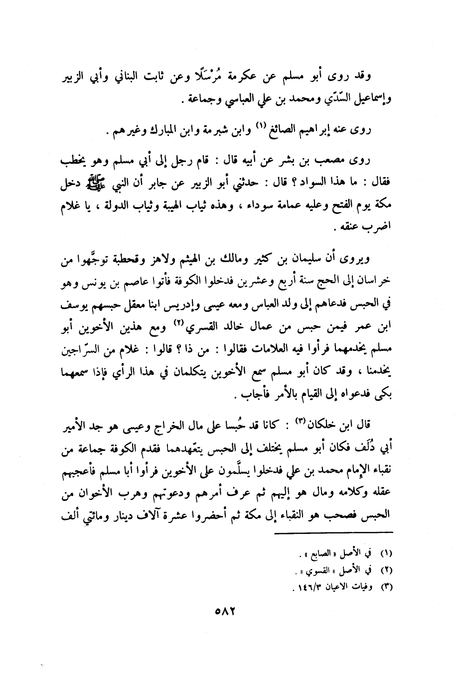 روى مصعب بن بشر عن أبيه قال: قام رجل إلى أَبِي مُسْلِم وهو يخطب فقال: ما هذا السواد؟ قال: حدثني أَبُو الزُّبَيْرِ عَنْ جَابِرٍ أَنّ النَّبِيَّ صَلَّى اللَّهُ عَلَيْهِ وَسَلَّمَ دَخَلَ مَكَّةَ يَوْمَ الْفَتْحِ وَعَلَيْهِ عِمَامَةٌ سوداء، وهذه ثياب الهيبة وثياب الدولة، يا غلام اضرب عنقه.