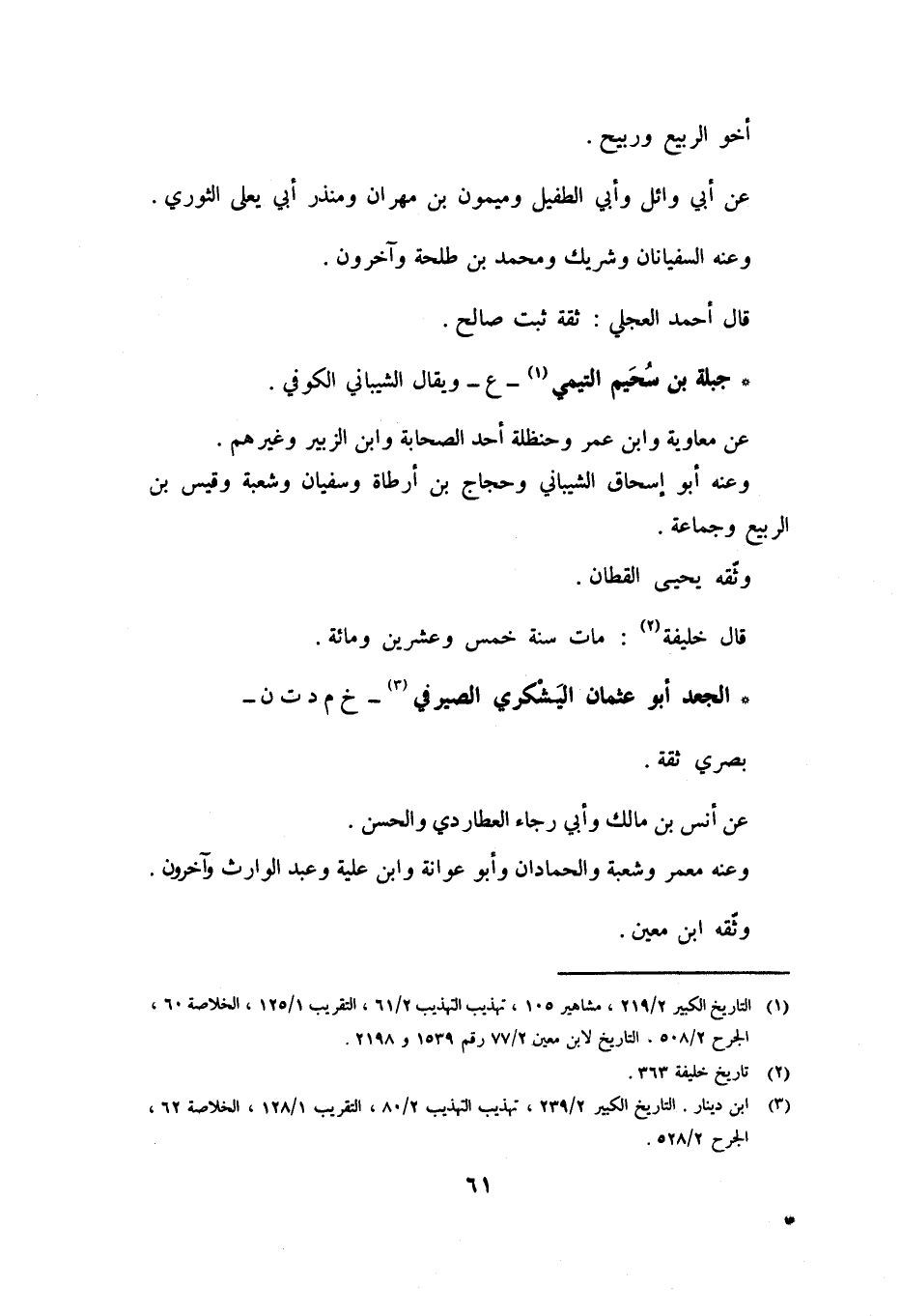 [3] ابن دينار. التاريخ الكبير 2/ 239، تهذيب التهذيب 2/ 80، التقريب 1/ 128، الخلاصة 62، الجرح 2/ 528.
