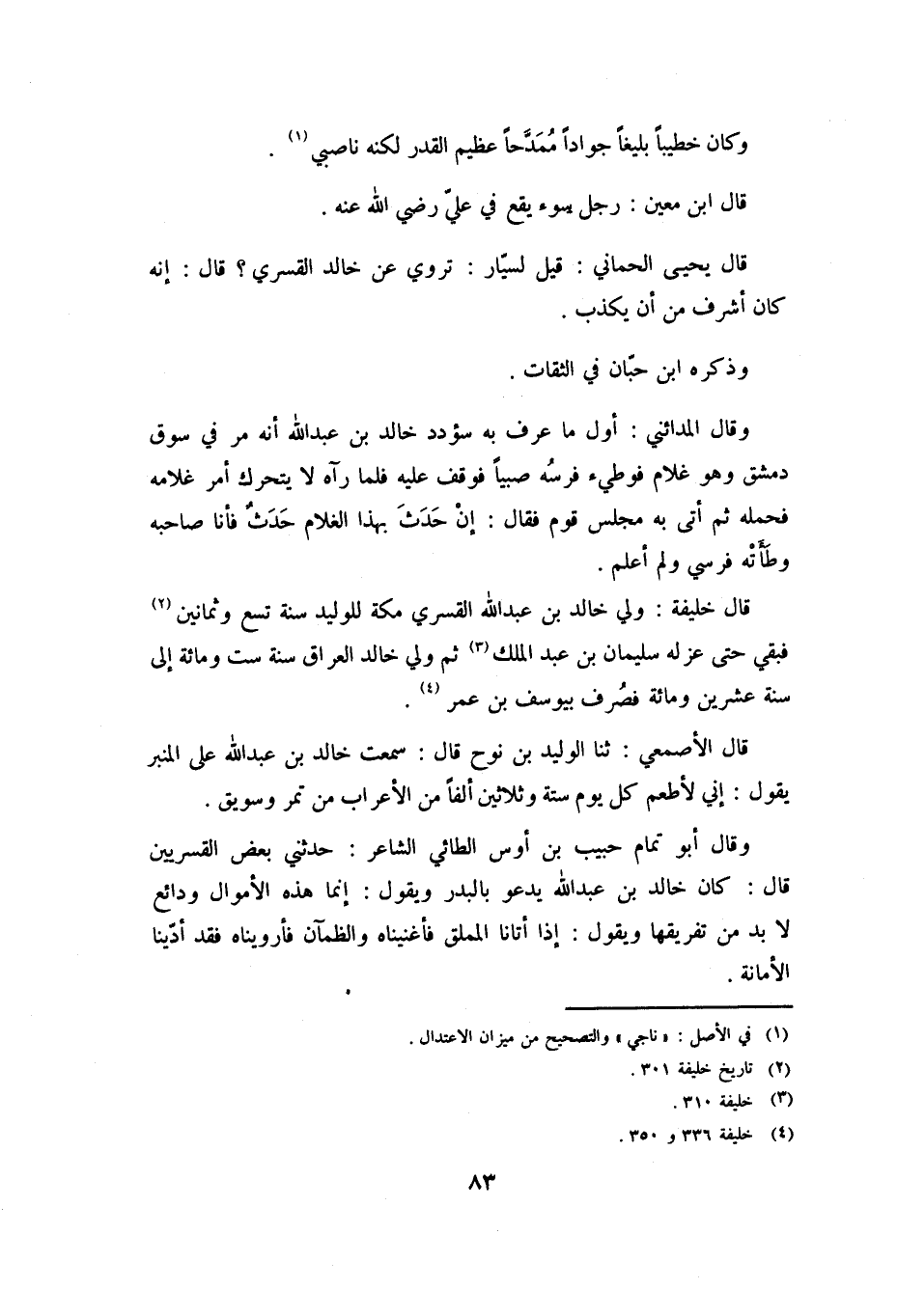 وَقَالَ أَبُو تَمَّامٍ حَبِيبُ بْنُ أَوْسٍ الطَّائِيُّ الشَّاعِرُ: حَدَّثَنِي بَعْضُ الْقَسْرِيِّينَ قَالَ: كَانَ خَالِدُ بْنُ عَبْدِ اللَّهِ يَدْعُو بِالْبَدْرِ وَيَقُولُ: إِنَّمَا هَذِهِ الأَمْوَالُ وَدَائِعُ لا بُدَّ مِنْ تَفْرِيقِهَا وَيَقُولُ: إِذَا أَتَانَا الْمُمْلِقُ فأغنيناه والظمآن فأرويناه فقد أدّينا الأمانة.