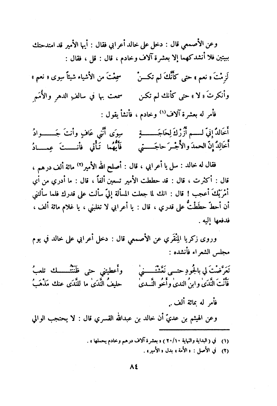 وَعَنِ الأَصْمَعِيِّ قَالَ: دَخَلَ عَلَى خَالِدٍ أَعْرَابِيُّ فَقَالَ: أَيُّهَا الأَمِيرُ قَدِ امْتَدَحْتُكَ بِبَيْتَيْنِ فَلا أُنْشِدُكُهُمَا إِلا بِعَشَرَةِ آلافٍ وَخَادِمٍ، قَالَ: قُلْ، فَقَالَ: