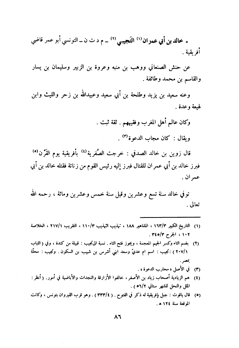 قَالَ زُوَيْنُ بْنُ خَالِدٍ الصَّدَفِيُّ: خَرَجَتِ الصُّفْرِيَّةُ [4] بِأَفْرِيقِيَّةَ يَوْمَ الْقَرْنِ [5] فَبَرَزَ خَالِدُ بْنُ أَبِي عِمْرَانَ لِلْقِتَالِ فَبَرَزَ إِلَيْهِ رَئِيسُ الْقَوْمِ مِنْ زِنَاتَةَ فَقَتَلَهُ خَالِدُ بْنُ أَبِي عِمْرَانَ.