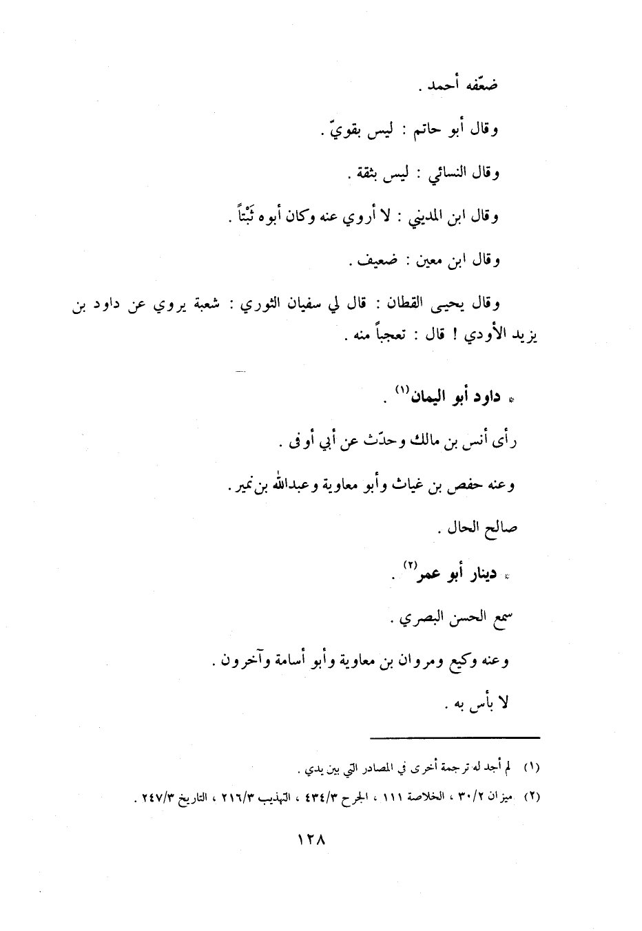 [2] ميزان 2/ 30، الخلاصة 111، الجرح 3/ 434، التهذيب 3/ 216، التاريخ 3/ 247.