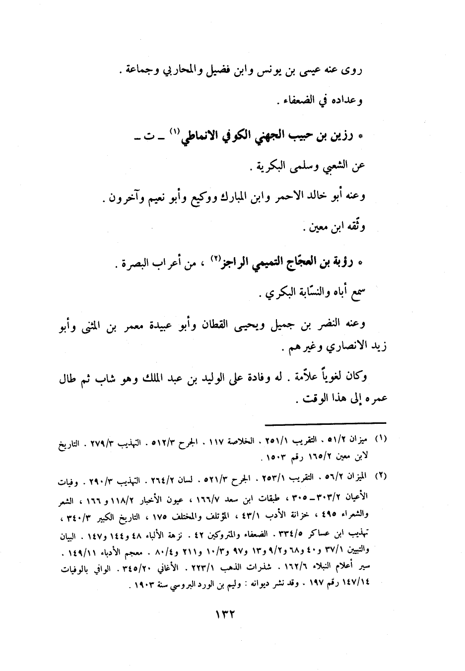 [2] الميزان 2/ 56، التقريب 1/ 253، الجرح 3/ 521، لسان 2/ 264، التهذيب 3/ 290. وفيات الأعيان 2/ 303- 305، طبقات ابن سعد 7/ 166، عيون الأخبار 2/ 118 و 166، الشعر والشعراء 495، خزانة الأدب 1/ 43، المؤتلف والمختلف 175، التاريخ الكبير 3/ 340، تهذيب ابن عساكر 5/ 334. الضعفاء والمتروكين 42. نزهة الألباء 48 و 144 و 147. البيان والتبيين 1/ 37 و 40 و 68 و 2/ 9 و 13 و 97 و 3/ 10 و 211 و 4/ 80. معجم الأدباء 11/ 149.