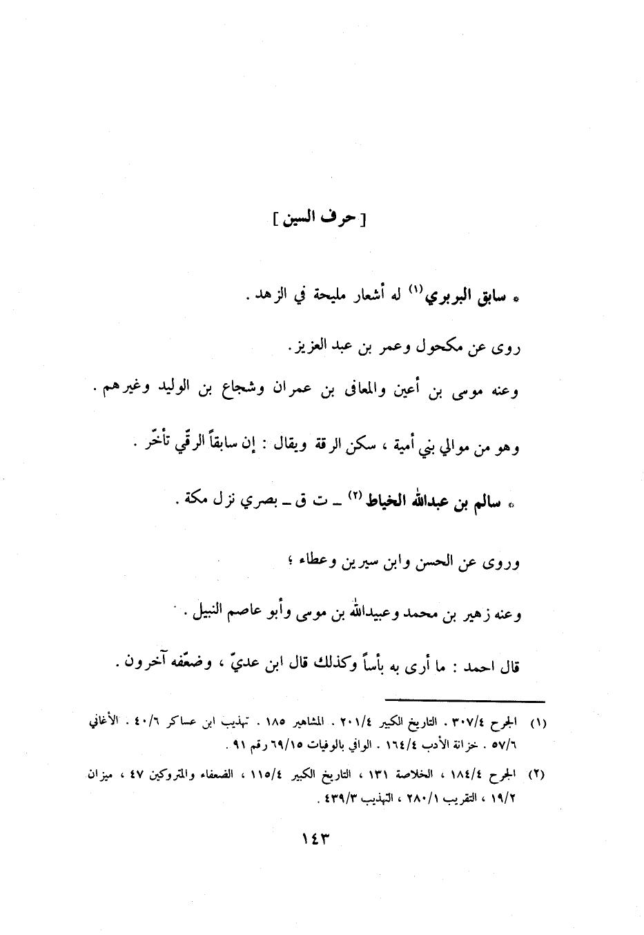 [2] الجرح 4/ 184، الخلاصة 131، التاريخ الكبير 4/ 115، الضعفاء والمتروكين 47، ميزان 2/ 19، التقريب 1/ 280، التهذيب 3/ 439.
