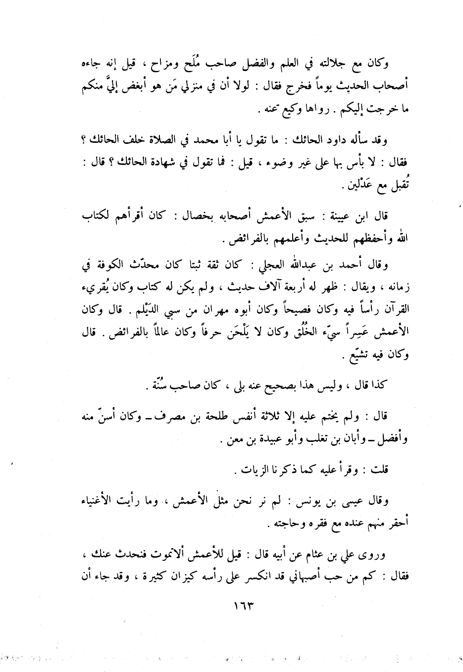 وقال أحمد بن عبد الله العِجْليّ: كان ثِقَةً ثَبْتًا كَانَ مُحَدِّثَ الْكُوفَةِ فِي زَمَانِهِ، وَيُقَالُ: ظَهَرَ لَهُ أَرْبَعَةُ آلافِ حَدِيثٍ، وَلَمْ يَكُنْ لَهُ كِتَابٌ وَكَانَ يُقْرِئُ الْقُرْآنَ رَأْسًا فِيهِ وَكَانَ فَصِيحًا وَكَانَ أَبُوهُ مِهْرَانُ مِنْ سبي الديلم. قال وكان الأعمش عسرا سيّئ الْخُلُقِ وَكَانَ لا يَلْحَنُ حَرْفًا وَكَانَ عَالِمًا بِالْفَرَائِضِ. قَالَ وَكَانَ فِيهِ تَشَيُّعٌ.