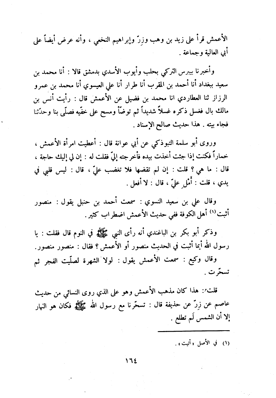 الأَعْمَشَ قَرَأَ عَلَى زَيْدِ بْنِ وَهْبٍ وَزِرٍّ وَإِبْرَاهِيمَ النَّخَعِيِّ، وَأَنَّهُ عَرَضَ أَيْضًا عَلَى أَبِي الْعَالِيَةِ وَجَمَاعَةٍ.