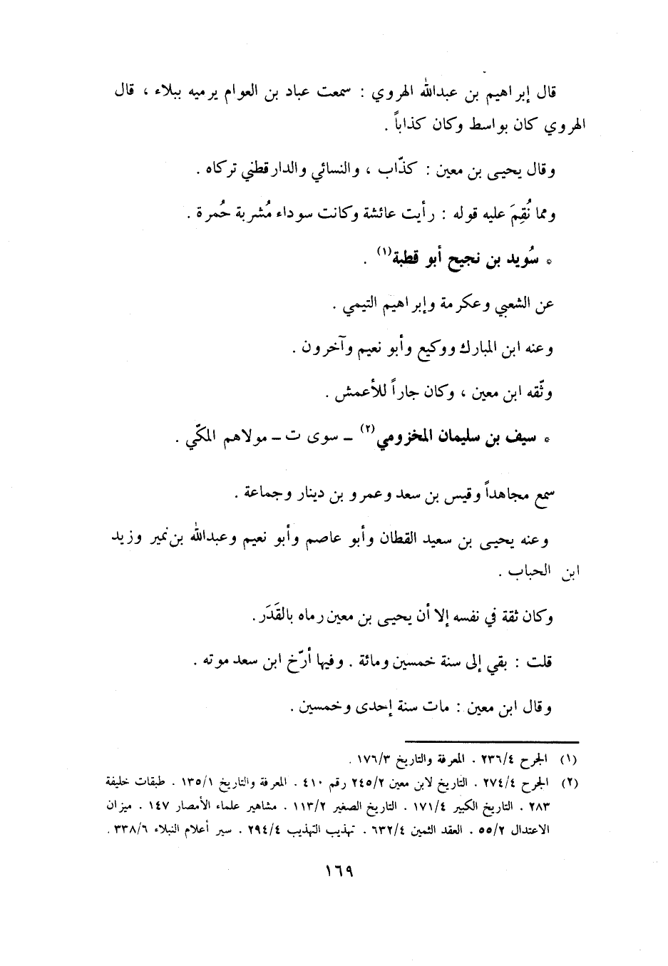 [2] الجرح 4/ 274، التاريخ لابن معين 2/ 245 رقم 410، المعرفة والتاريخ 1/ 135، طبقات خليفة 283، التاريخ الكبير 4/ 171، التاريخ الصغير 2/ 113، مشاهير علماء الأمصار 147، ميزان الاعتدال 2/ 55، العقد الثمين 4/ 632، تهذيب التهذيب 4/ 294، سير أعلام النبلاء 6/ 338.
