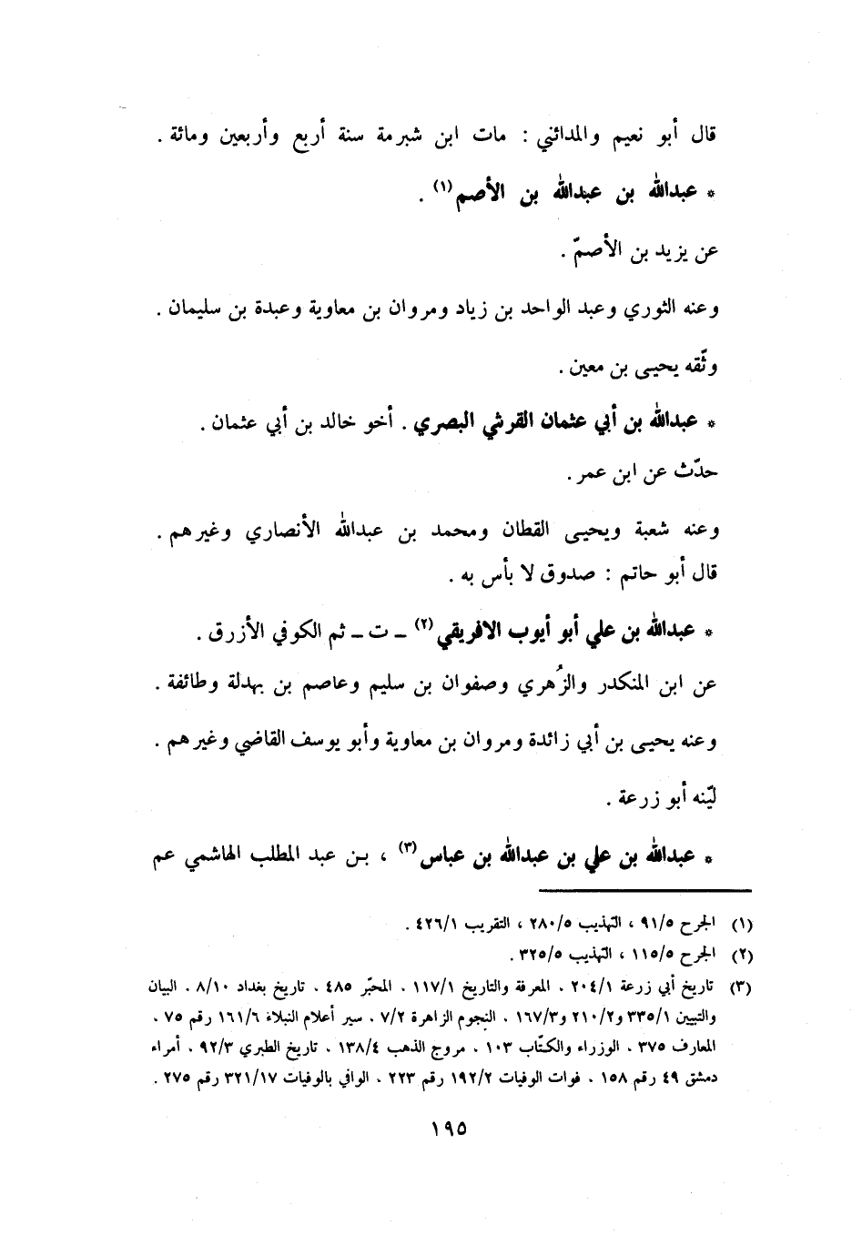 [3] تاريخ أبي زرعة 1/ 204، المعرفة والتاريخ 1/ 117، المحبّر 485، تاريخ بغداد 10/ 8، البيان والتبيين 1/ 335 و 2/ 210 و 3/ 167، النجوم الزاهرة 2/ 7، سير أعلام النبلاء 6/ 161 رقم 75، المعارف 375، الوزراء والكتّاب 103، مروج الذهب 4/ 138، تاريخ الطبري 3/ 92، أمراء دمشق 49 رقم 158، فوات الوفيات 2/ 192 رقم 223، الوافي بالوفيات 17/ 321 رقم 275.