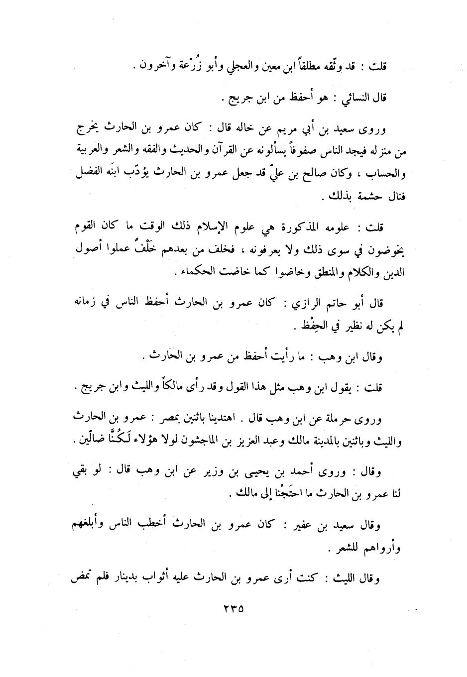 وَقَالَ ابْنُ وَهْبٍ: مَا رَأَيْتُ أَحْفَظَ مِنْ عَمْرِو بْنِ الْحَارِثِ.