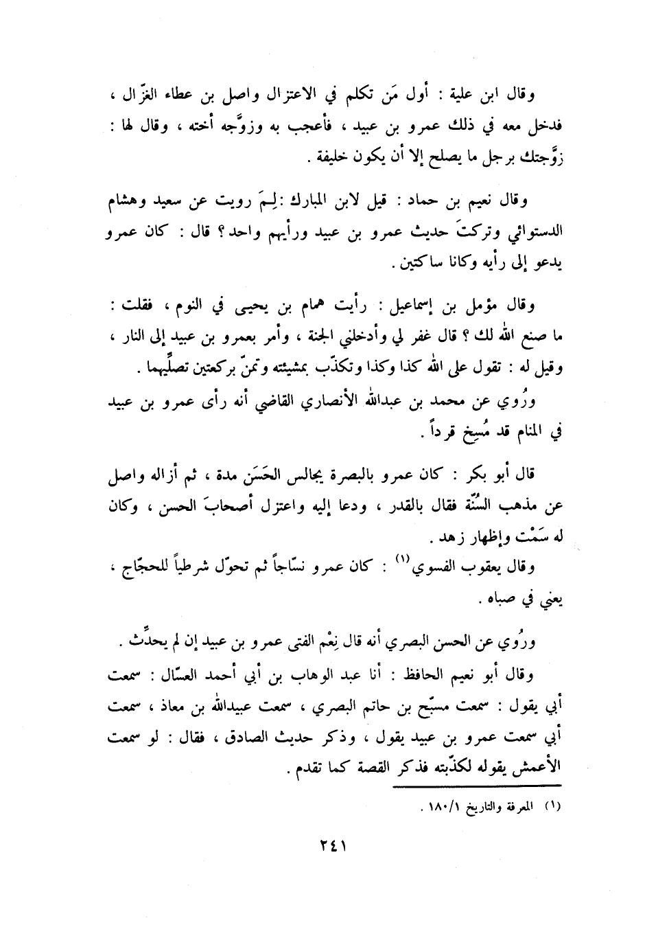 وَقَالَ ابْنُ عُلَيَّةَ: أَوَّلُ مَنَ تَكَلَّمَ فِي الاعْتِزَالِ وَاصِلُ بْنُ عَطَاءٍ الْغَزَّالُ، فَدَخَلَ مَعَهُ فِي ذَلِكَ عَمْرُو بْنُ عُبَيْدٍ، فَأُعْجِبَ بِهِ وَزَوَّجَهُ أُخْتَهُ، وَقَالَ لَهَا: