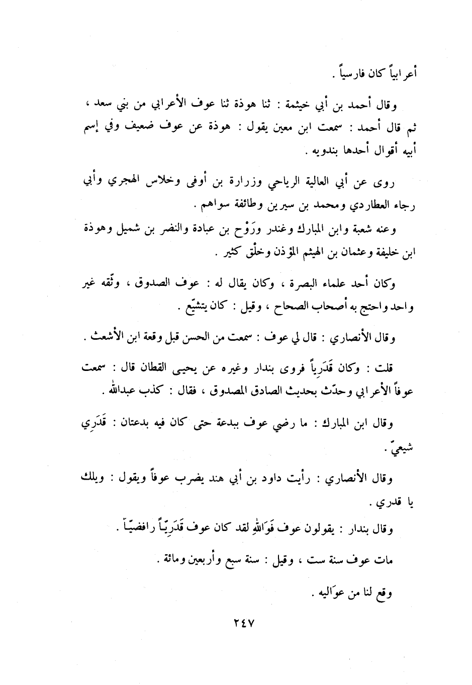 قُلْتُ: وَكَانَ قَدَرِيًّا فَرَوَى بُنْدَارٌ وَغَيْرُهُ عَنْ يَحْيَى الْقَطَّانِ قَالَ: سَمِعْتُ عَوْفًا الأَعْرَابِيَّ وَحَدَّثَ بِحَدِيثِ الصَّادِقِ الْمَصْدُوقِ، فَقَالَ: كَذَبَ عَبْدُ اللَّهِ.