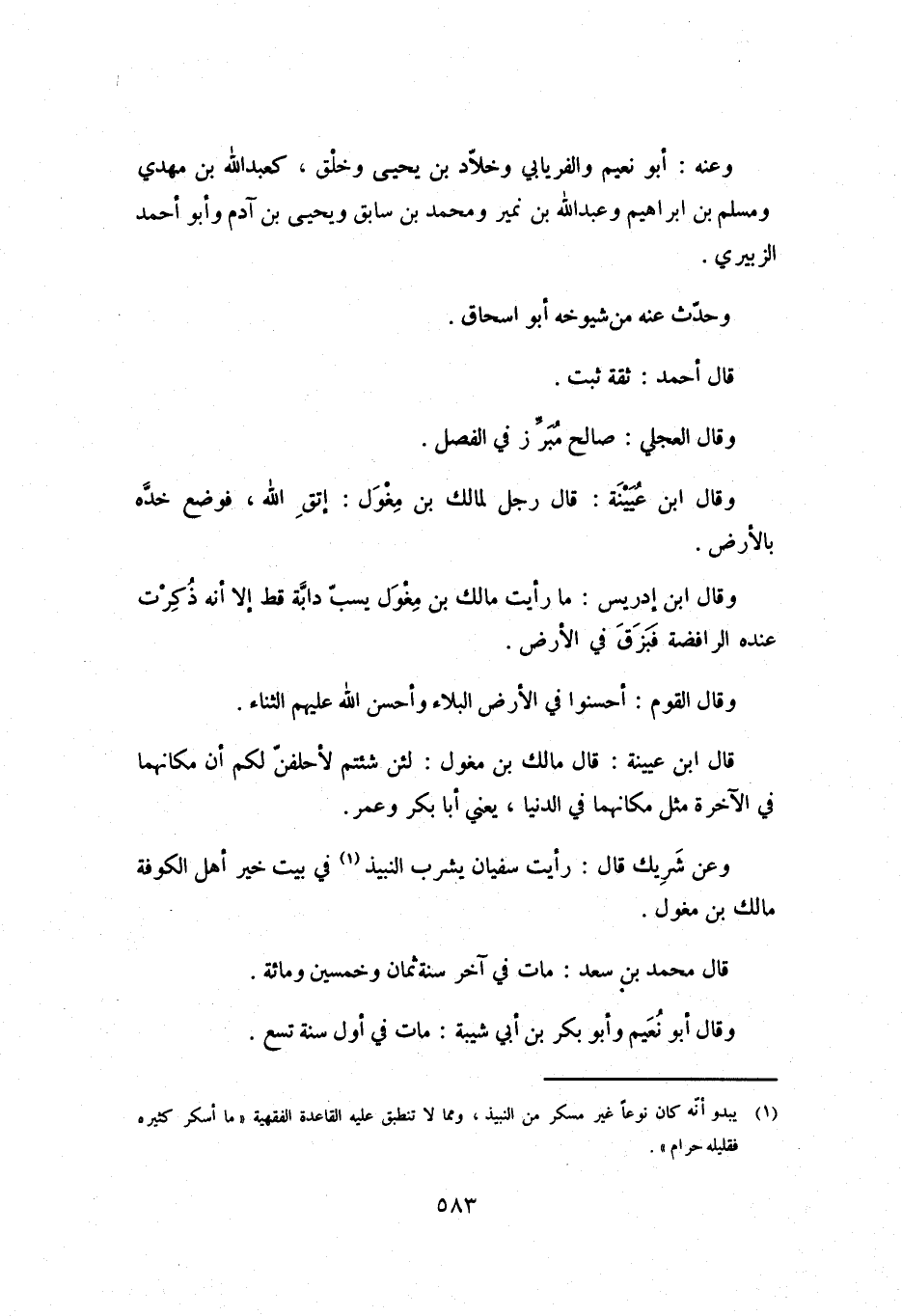 وعن شَرِيك قَالَ: رَأَيْت سُفْيَان يشرب النبيذ [1] فِي بيت خير أَهْل الكوفة مالك بْن مغول.
