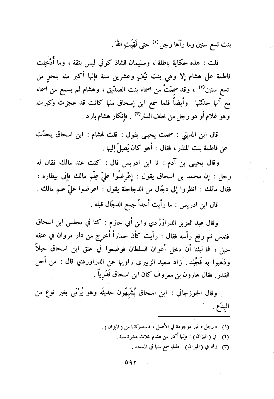 قُلْتُ: هَذِهِ حكاية باطلة، وَسُلَيْمَان الشاذكوني ليس بثقة، وما أُدْخِلت فاطمة عَلَى هشام إلا وهي بِنْت نيّفٍ وعشرين سنة فإنها أكبر مِنْهُ بنحوٍ من تسع سنين [2] ، وقد سَمِعْت من أسماء بنت الصديق، وهشام لم يسمع من أسماء مَعَ أنها حدثتها. وأيضا فَلَمَّا سَمِعَ ابْن إِسْحَاق منها كَانَتْ قد عجزت وكبرت وهو غلام أو هُوَ رَجُل من خلف الستر [3] . فإنكار هشام بارد.