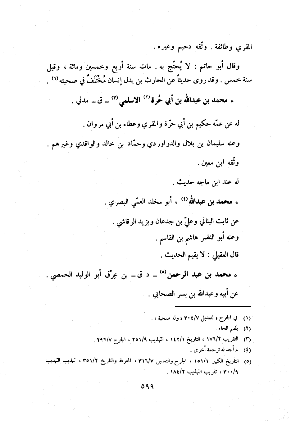 [5] التاريخ الكبير 1/ 151، الجرح والتعديل 7/ 316، المعرفة والتاريخ 2/ 351، تهذيب التهذيب 9/ 300، تقريب التهذيب 2/ 184.