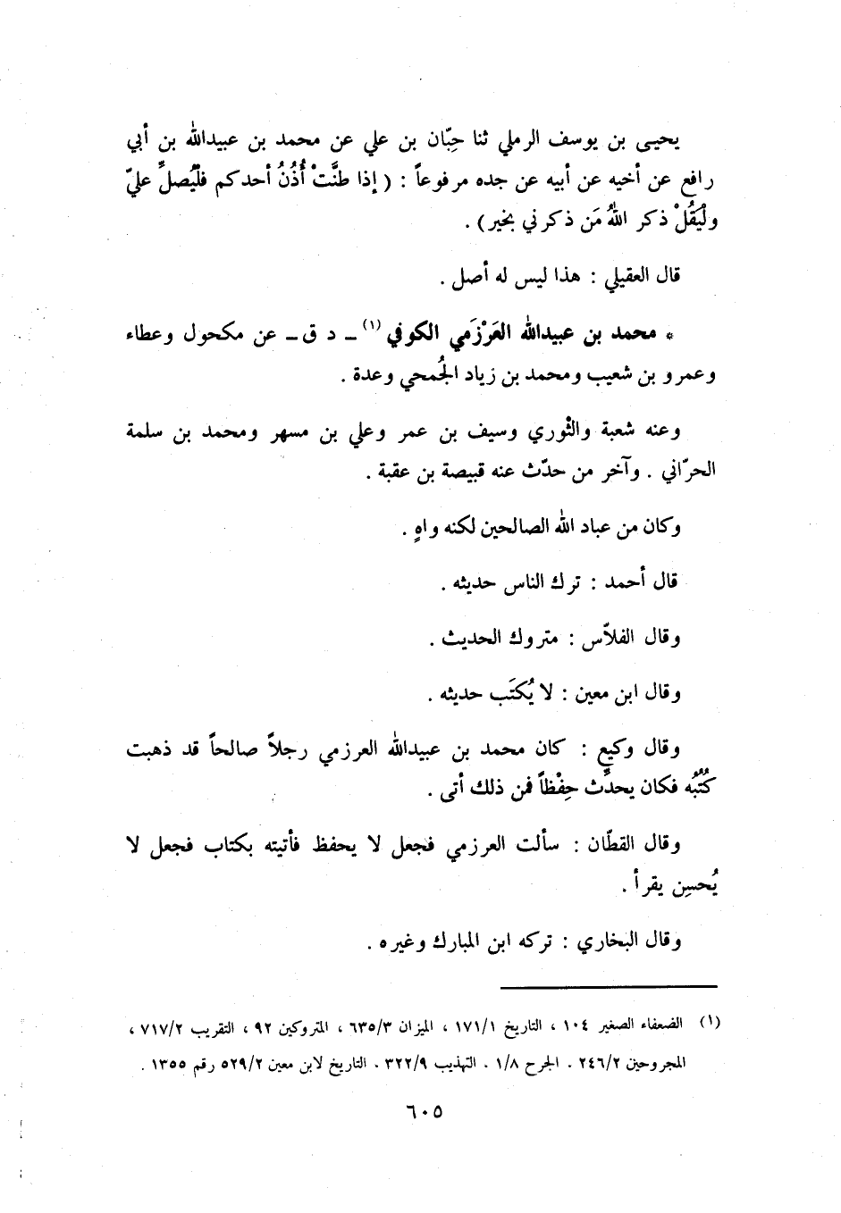 [1] الضعفاء الصغير 104، التاريخ 1/ 171، الميزان 3/ 635، المتروكين 92، التقريب 2/ 717، المجروحين 2/ 246، الجرح 8/ 1، التهذيب 9/ 322، التاريخ لابن معين 2/ 529 رقم 1355.