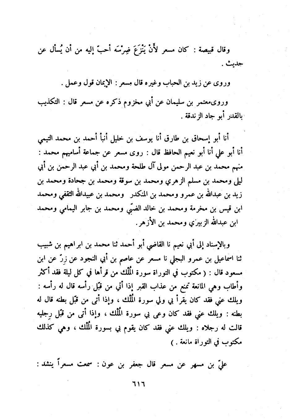 ويلك عني فقد كَانَ يقرأ بِي ولي سورة المُلْك، وَإِذَا أتى من قبل بطنه قَالَ لَهُ بطنه: ويلك عني فقد كَانَ وعى بِي سورة المُلْك، وَإِذَا أتى من قبل رِجليه قَالَتْ لَهُ رجلاه: ويلك عني فقد كَانَ يقوم بِي بسورة المُلْك، وهي كذلك مكتوب فِي التوراة مانعة.) عليّ بْن مسهر عَن مسعر قَالَ جعفر بْن عون: سَمِعْت مسعرا ينشد: