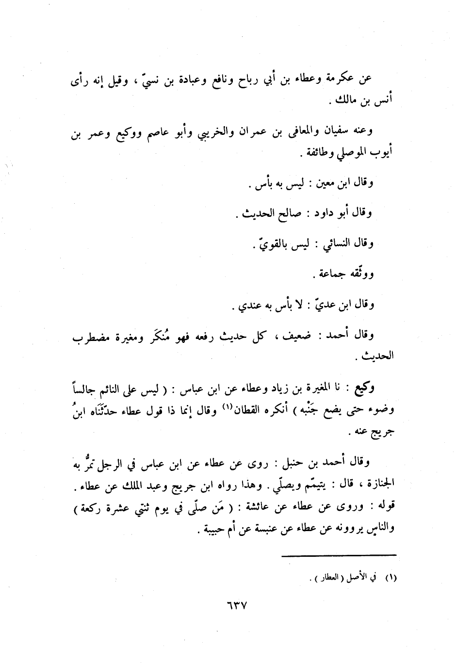 وكيع: نا المغيرة بْن زياد وعطاء عَن ابْن عَبَّاس: (ليس عَلَى النائم جالسًا وضوء حَتَّى يضع جَنْبه) أنكره القطَّان [1] وقال إنما ذا قول عطاء حدّثَنَاه ابنُ جريج عَنْهُ.