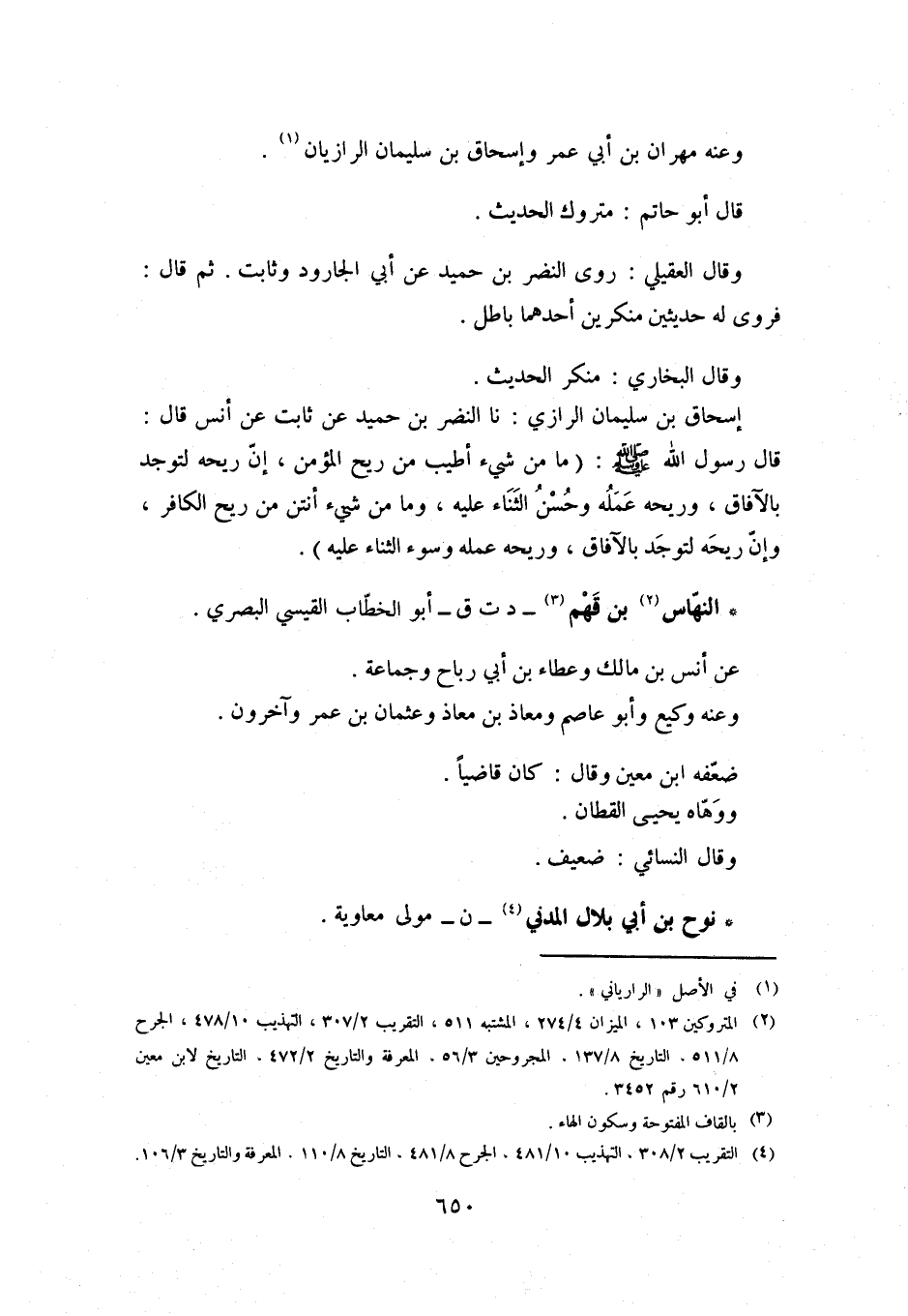 قَالَ رَسُولُ اللَّهِ صَلَّى اللَّهُ عَلَيْهِ وَسَلَّمَ: (مَا مِنْ شَيْءٍ أَطْيَبُ مِنْ رِيحِ الْمُؤْمِنِ، إِنَّ رِيحَهُ لَتُوجَدُ بِالآفَاقِ، وَرِيحُهُ عَمَلُهُ وَحُسْنُ الثَّنَاءِ عَلَيْهِ، وَمَا مِنْ شَيْءٍ أَنْتَنُ مِنْ رِيحِ الْكَافِرِ، وَإِنَّ رِيحَهُ لَتُوجَدُ بِالآفَاقِ، وَرِيحُهُ عَمَلُهُ وَسُوءُ الثَّنَاءِ عَلَيْهِ) . النهاس [2] بن قهم [3]- د ت ق- أبو الخطّاب القيسي البصري.