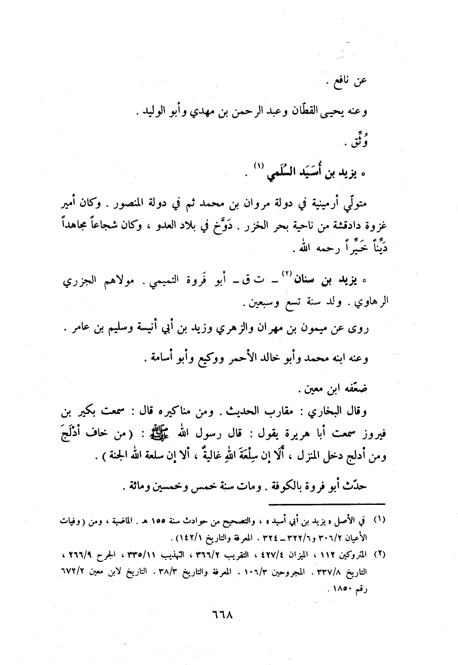 [1] في الأصل «يزيد بن أبي أسيد» ، والتصحيح من حوادث سنة 155 هـ. الماضية، ومن (وفيات الأعيان 2/ 306 و 6/ 322- 324، المعرفة والتاريخ 1/ 142) .