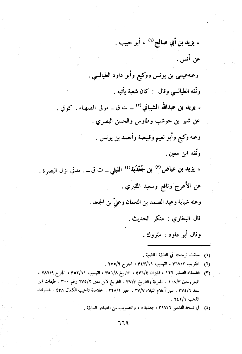 [3] الضعفاء الصغير 122، الميزان 4/ 436، التاريخ 8/ 351، التهذيب 11/ 352، الجرح 9/ 282، المجروحين 3/ 108، المعرفة والتاريخ 3/ 37، التاريخ لابن معين 2/ 675 رقم 300، طبقات ابن سعد 6/ 374، سير أعلام النبلاء 7/ 27، العبر 1/ 228، خلاصة تذهيب الكمال 438، شذرات الذهب 1/ 242.