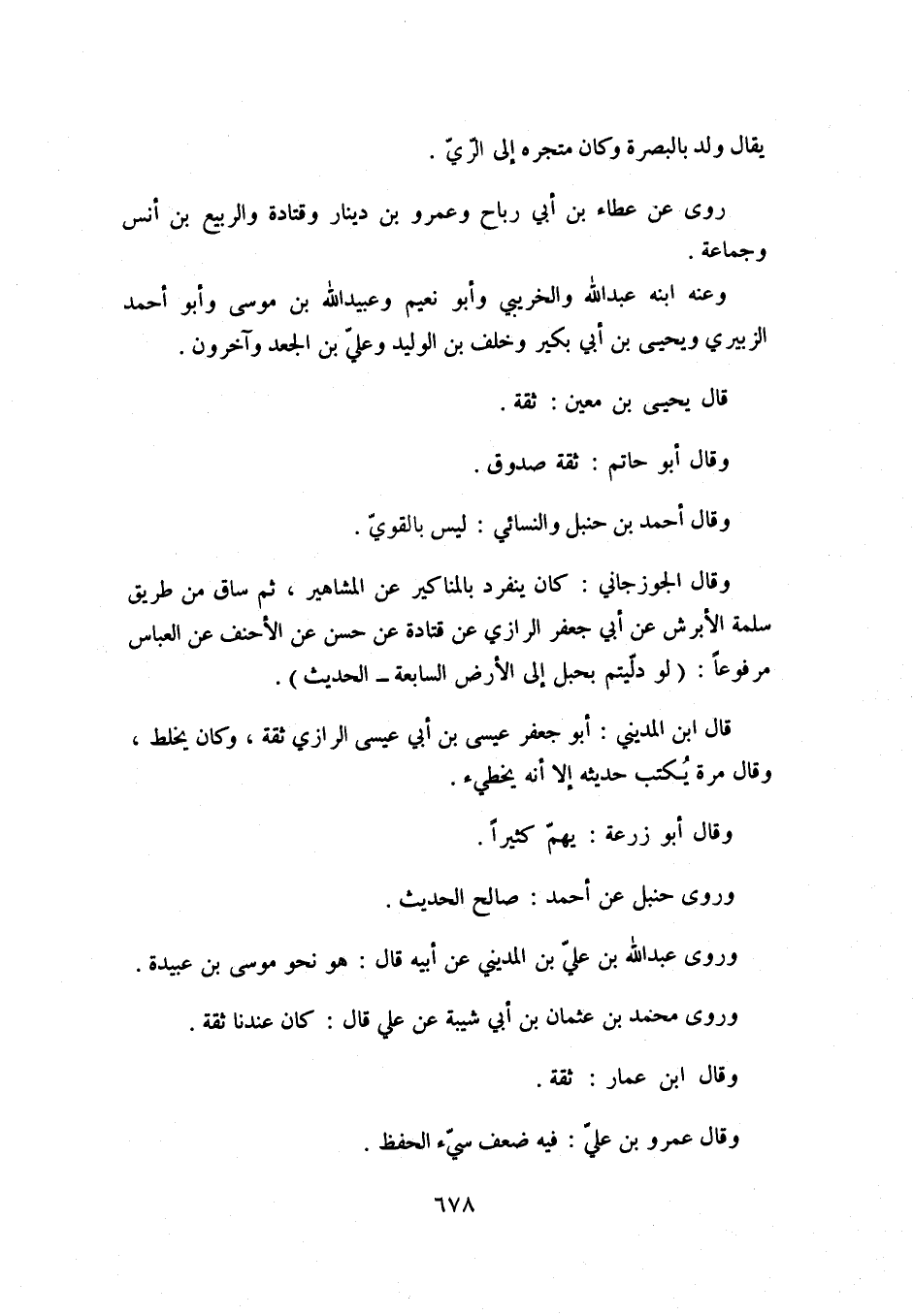 وَقَالَ الْجُوزْجَانِيُّ: كَانَ يَنْفَرِدُ بِالْمَنَاكِيرِ عَنِ الْمَشَاهِيرِ، ثُمَّ سَاقَ مِنْ طَرِيقِ سَلَمَةَ الأَبْرَشِ عَنْ أَبِي جَعْفَرٍ الرَّازِيِّ عَنْ قَتَادَةَ عَنْ حَسَنٍ عَنِ الأَحْنَفِ عَنِ الْعَبَّاسِ مَرْفُوعًا: (لَوْ دُلِّيتُمْ بِحَبْلٍ إِلَى الأَرْضِ السَّابِعَةِ- الْحَدِيثَ) . قَالَ ابْن المديني: أَبُو جَعْفَر عِيسَى بْن أَبِي عِيسَى الرازي ثقة، وكان يخلط، وقال مرة يُكتب حديثه إلا أَنَّهُ يخطئ.