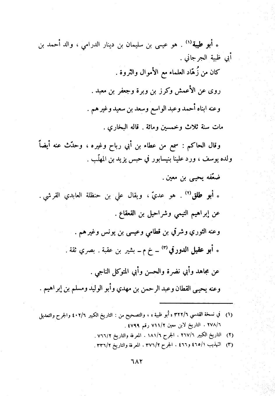 [1] في نسخة القدسي 6/ 322 «أبو ظبية» ، والتصحيح من: التاريخ الكبير 6/ 402 والجرح والتعديل 6/ 278، التاريخ لابن معين 2/ 711 رقم 4799.