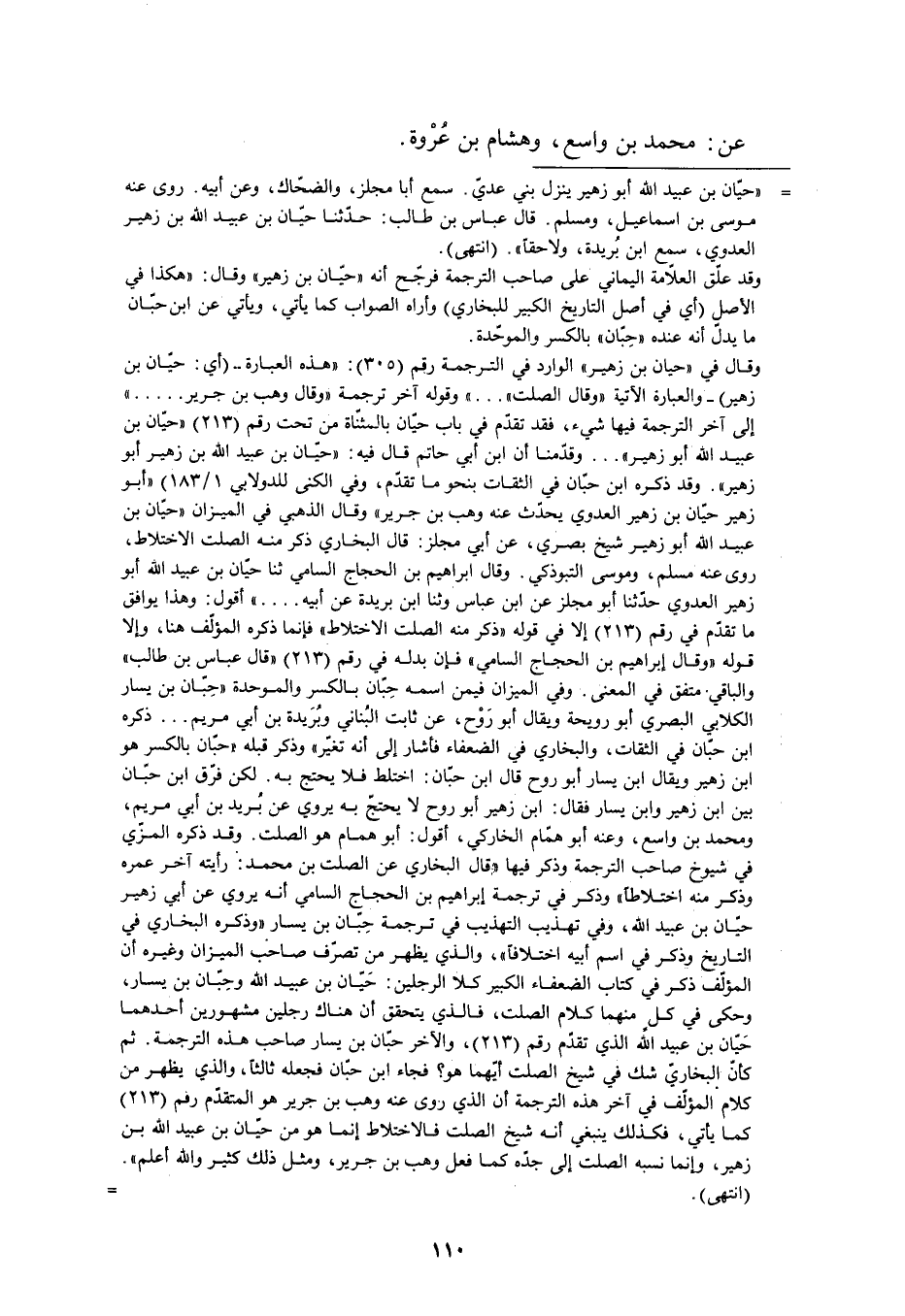 وقال في «حيان بن زهير» الوارد في الترجمة رقم (305) : «هذه العبارة. «أي: حيّان بن زهير) - والعبارة الآتية «وقال الصلت» ... » وقوله آخر ترجمة «وقال وهب بن جرير.....» إلى آخر الترجمة فيها شيء، فقد تقدّم في باب حيّان بالمثنّاة من تحت رقم (213) «حيّان بن عبيد الله أبو زهير» . وقدّمنا أن ابن أبي حاتم قال فيه: «حيّان بن عبيد الله بن زهير أبو زهير» . وقد ذكره ابن حبّان في الثقات بنحو ما تقدّم، وفي الكنى للدولابي 1/ 183) «أبو زهير حيّان بن زهير العدوي يحدّث عنه وهب بن جرير» وقال الذهبي في الميزان «حيّان بن عبيد الله أبو زهير شيخ بصري، عن أبي مجلز: قال البخاري ذكر منه الصلت الاختلاط، روى عنه مسلم، وموسى التبوذكي. وقال إبراهيم بن الحجاج السامي ثنا حيّان بن عبيد الله أبو زهير العدوي حدّثنا أبو مجلز عن ابن عباس وثنا ابن بريدة عن أبيه....» أقول: وهذا يوافق ما تقدّم في رقم (213) إلّا في قوله «ذكر منه الصلت الاختلاط» فإنما ذكره المؤلّف هنا، وإلّا قوله «وقال إبراهيم بن الحجاج السامي» فإن بدله في رقم (213) قال عباس بن طالب» والباقي. متفق في المعنى. وفي الميزان فيمن اسمه حبّان بالكسر والموحدة «حبّان بن يسار الكلابي البصري أبو رويحة ويقال أبو روح، عن ثابت البناني وبريدة بن أبي مريم ... ذكره ابن حبّان في الثقات، والبخاري في الضعفاء فأشار إلى أنه تغيّر» وذكر قبله «حبّان بالكسر هو ابن زهير ويقال ابن يسار أبو روح قال ابن حبّان: اختلط فلا يحتج به. لكن فرّق ابن حبّان بين ابن زهير وابن يسار فقال: ابن زهير أبو روح لا يحتجّ به يروي عن بريد بن أبي مريم، ومحمد بن واسع، وعنه أبو همّام الخاركي، أقول: أبو همام هو الصلت. وقد ذكره المزّي في شيوخ صاحب الترجمة وذكر فيها «قال البخاري عن الصلت بن محمد: رأيته آخر عمره وذكر منه اختلاطا» وذكر في ترجمة إبراهيم بن الحجاج السامي أنه يروي عن أبي زهير حيّان بن عبيد الله، وفي تهذيب التهذيب في ترجمة حبّان بن يسار «وذكره البخاري في التاريخ وذكر في اسم أبيه اختلافا» ، والّذي يظهر من تصرّف صاحب الميزان وغيره أن المؤلّف ذكر في كتاب الضعفاء الكبير كلا الرجلين: حيّان بن عبيد الله وحبّان بن يسار، وحكى في كل منهما كلام الصلت، فالذي يتحقق أن هناك رجلين مشهورين أحدهما حيّان بن عبيد الله الّذي تقدّم رقم (213) ، والآخر حبّان بن يسار صاحب هذه الترجمة. ثم كأنّ البخاريّ شك في شيخ الصلت أيّهما هو؟ فجاء ابن حبّان فجعله ثالثا، والّذي يظهر من كلام المؤلّف في آخر هذه الترجمة أن الّذي روى عنه وهب بن جرير هو المتقدّم رقم (213) كما يأتي، فكذلك ينبغي أنه شيخ الصلت فالاختلاط إنما هو من حيّان بن عبيد الله بن زهير، وإنّما نسبه الصلت إلى جدّه كما فعل وهب بن جرير، ومثل ذلك كثير والله أعلم» .