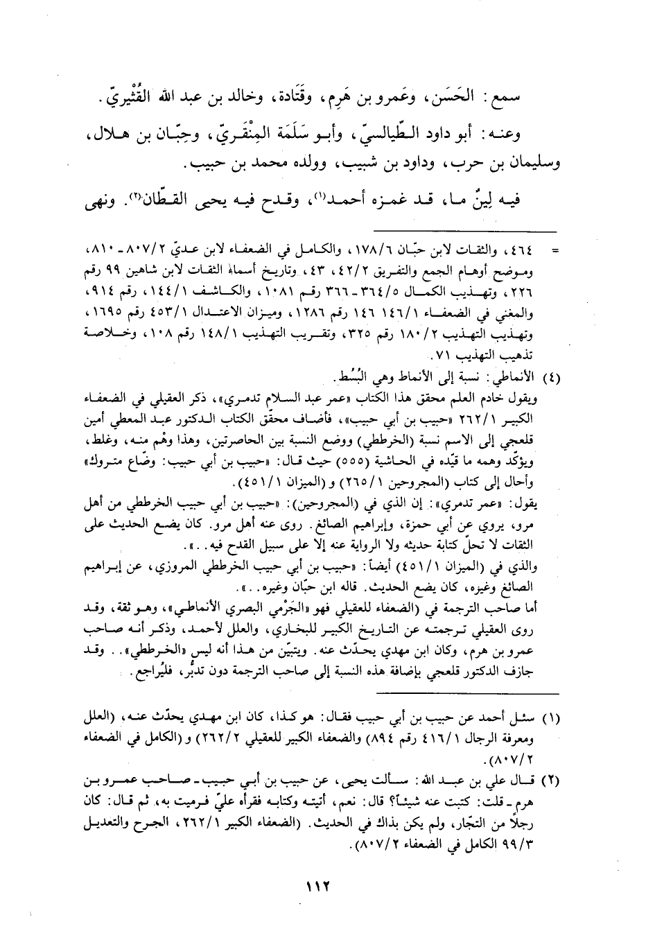 ويقول خادم العلم محقق هذا الكتاب «عمر عبد السلام تدمري» ، ذكر العقيلي في الضعفاء الكبير 1/ 262 «حبيب بن أبي حبيب» ، فأضاف محقّق الكتاب الدكتور عبد المعطي أمين قلعجي إلى الاسم نسبة (الخرططي) ووضع النسبة بين الحاصرتين، وهذا وهم منه، وغلط، ويؤكّد وهمه ما قيّده في الحاشية (555) حيث قال: «حبيب بن أبي حبيب: وضّاع متروك» وأحال إلى كتاب (المجروحين 1/ 265) و (الميزان 1/ 451) .