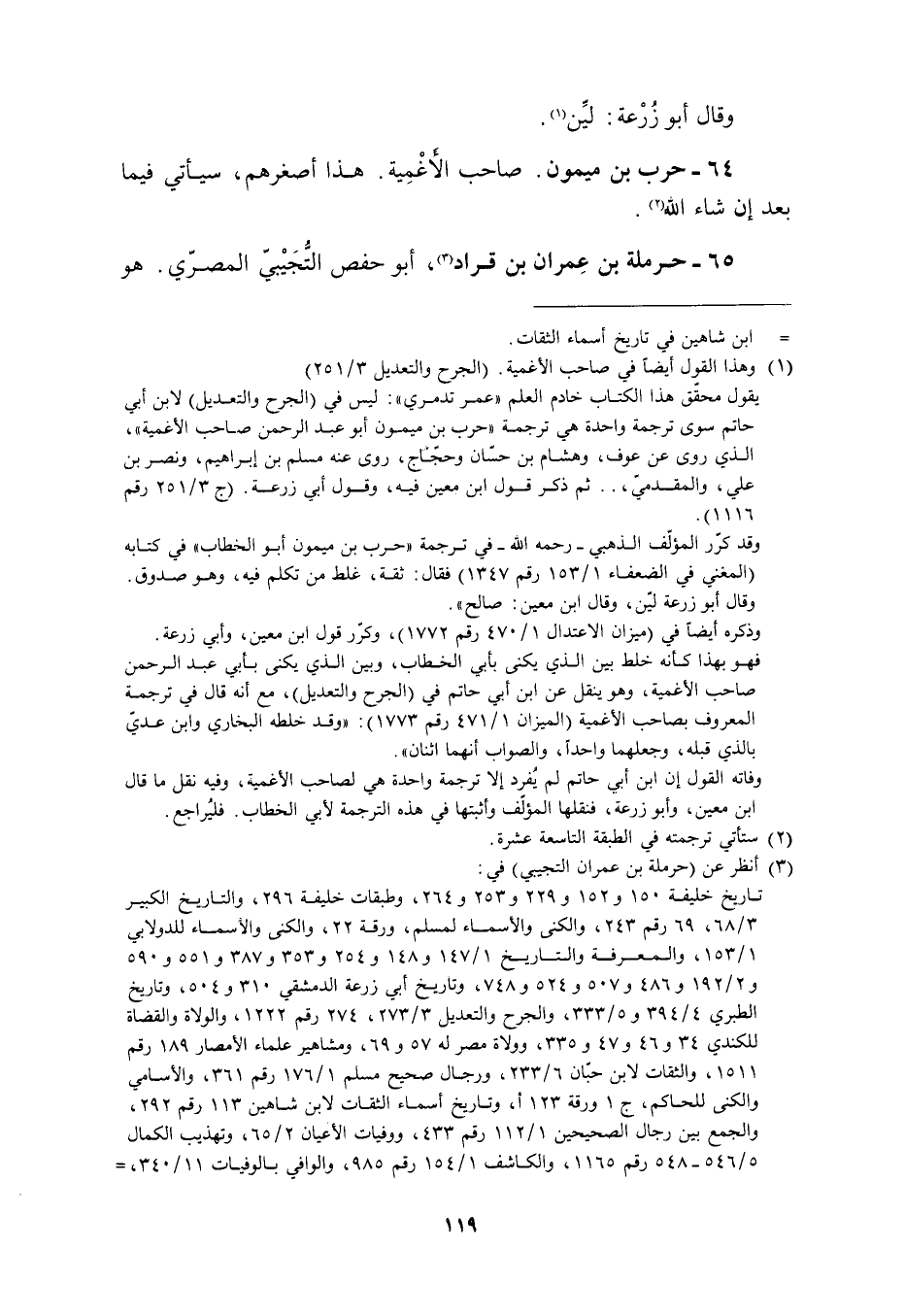 [1] وهذا القول أيضا في صاحب الأغمية. (الجرح والتعديل 3/ 251) يقول محقّق هذا الكتاب خادم العلم «عمر تدمري» : ليس في (الجرح والتعديل) لابن أبي حاتم سوى ترجمة واحدة هي ترجمة «حرب بن ميمون أبو عبد الرحمن صاحب الأغمية» ، الّذي روى عن عوف، وهشام بن حسّان وحجّاج، روى عنه مسلم بن إبراهيم، ونصر بن علي، والمقدميّ،.. ثم ذكر قول ابن معين فيه، وقول أبي زرعة. (ج 3/ 251 رقم 1116) .
