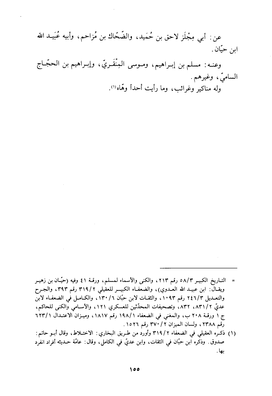 [ () ] التاريخ الكبير 3/ 58 رقم 213، والكنى والأسماء لمسلم، ورقة 41 وفيه (حيّان بن زهير ويقال: ابن عبيد الله العدوي) ، والضعفاء الكبير للعقيليّ 2/ 319 رقم 393، والجرح والتعديل 3/ 246 رقم 1093، والثقات لابن حبّان 6/ 130، والكامل في الضعفاء لابن عديّ 2/ 831، 832، وتصحيفات المحدّثين للعسكريّ 121، والأسامي والكنى للحاكم، ج 1 ورقة 208 ب، والمغني في الضعفاء 1/ 198 رقم 1817، وميزان الاعتدال 1/ 623 رقم 2388، ولسان الميزان 2/ 370 رقم 1526.